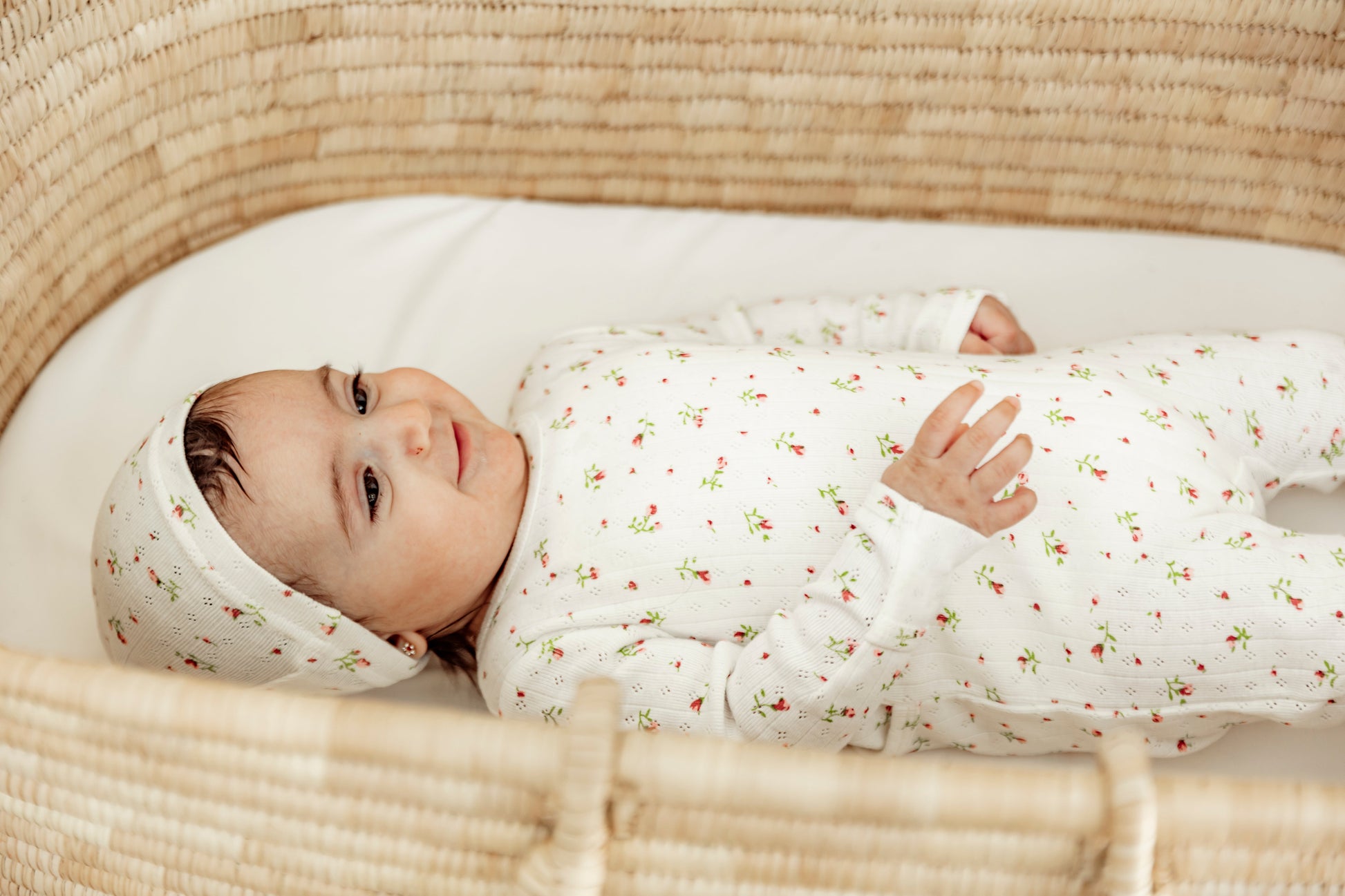 Baby girls cotton allover floral print onesie with snap opening at center back, elastic at back ankle with matching hat. ֲ