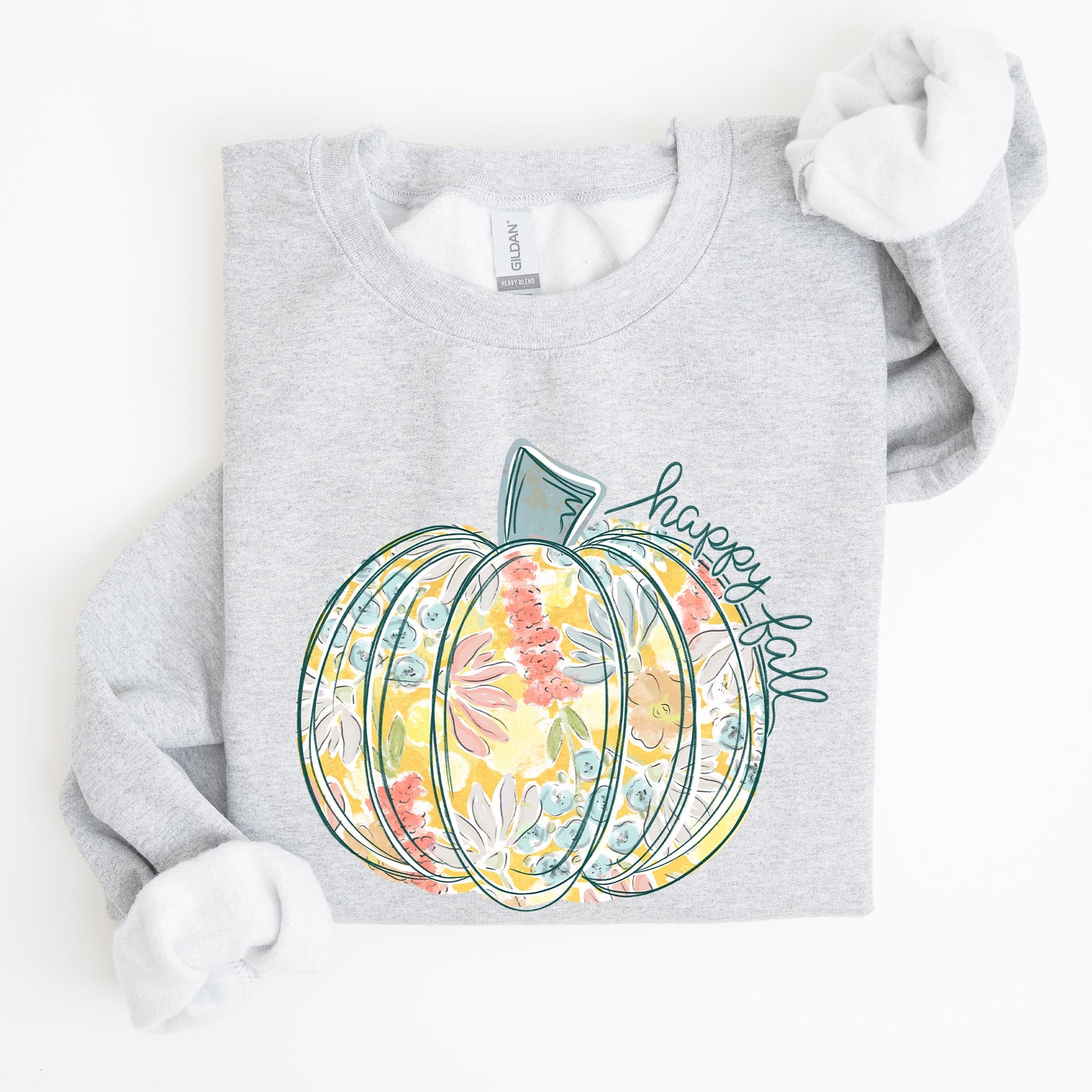 Embrace the spirit of the season with our Floral Pumpkin, Happy Fall, Pastels, Flowers, Autumn, Thanksgiving Sweatshirt. Perfectly blending comfort with stylish design, this cozy sweatshirt is an essential addition to your autumn wardrobe. Crafted from a soft cotton and polyester blend, it features a brushed fleece interior that ensures warmth and comfort for those chilly fall days.