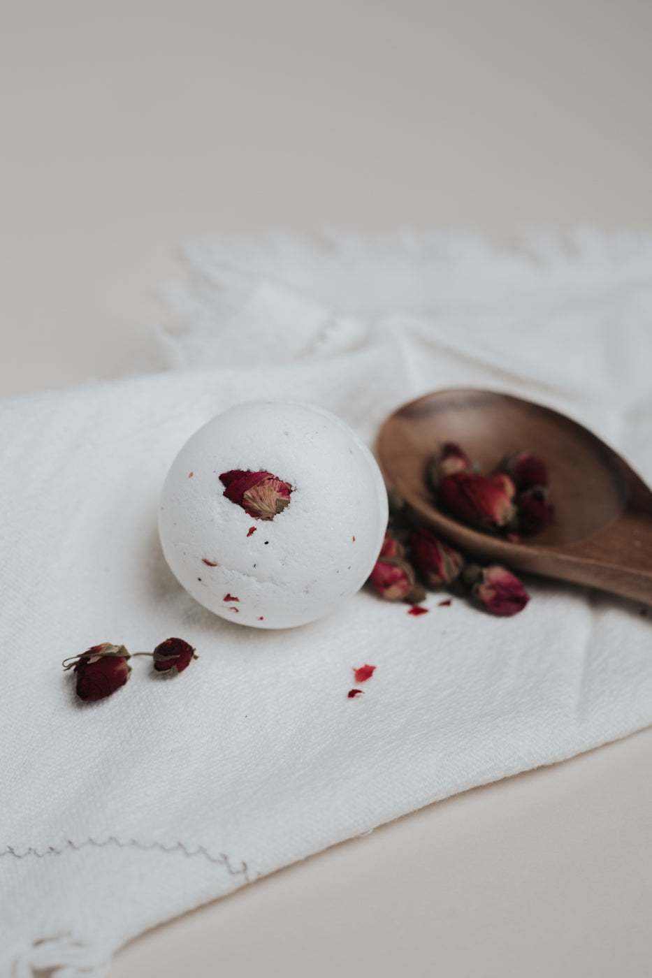 Ingredients: sodium bicarbonate, citric acid, grapeseed oil, purified water, essential oils and/or fragrance oil, flower petals