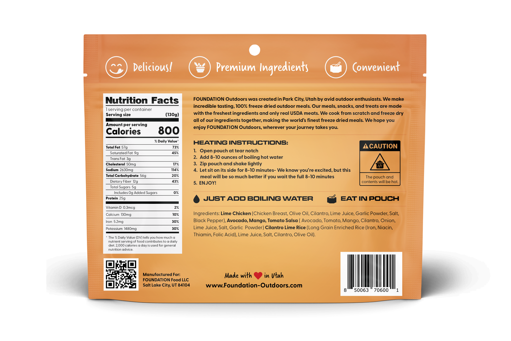 FOUNDATIONOutdoorsfreeze dried Lime Chicken with Avocado Mango Salsa is another flavor-packed meal you can only find at FOUNDATIONOutdoors. This tropical, fresh dish has large pieces of farm fresh USDA white chicken breast smothered in a cilantro lime sauce. This super tasty meal is accompanied by fresh avocado mango, and tomato that were harvested at their peak of ripeness on a bed of white rice with notes of lime accentuating the dish.