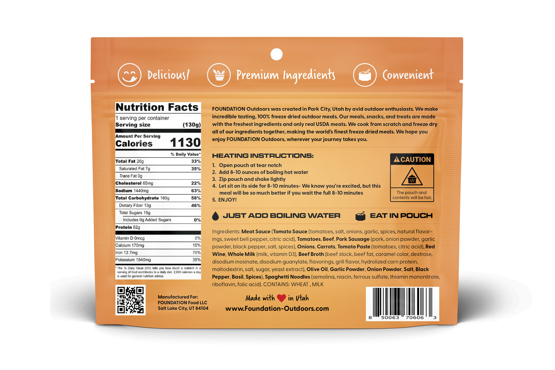 FOUNDATION Outdoors Spaghetti with Meat Sauce Freeze Dried Meal is a classic and comforting Italian dish that combines tender strands of spaghetti pasta with a rich, flavorful seasoned beef and Italian sausage tomato sauce. Our meat sauce is made the traditional Italian way using both beef and pork sausage. This entree includes a hearty tomato base with zesty spices and blended with onions, garlic, carrots, beef broth, and peppers. Actual red wine is added to accentuate the balance of flavors and maximize the complex notes of our authentic Italian sauce.