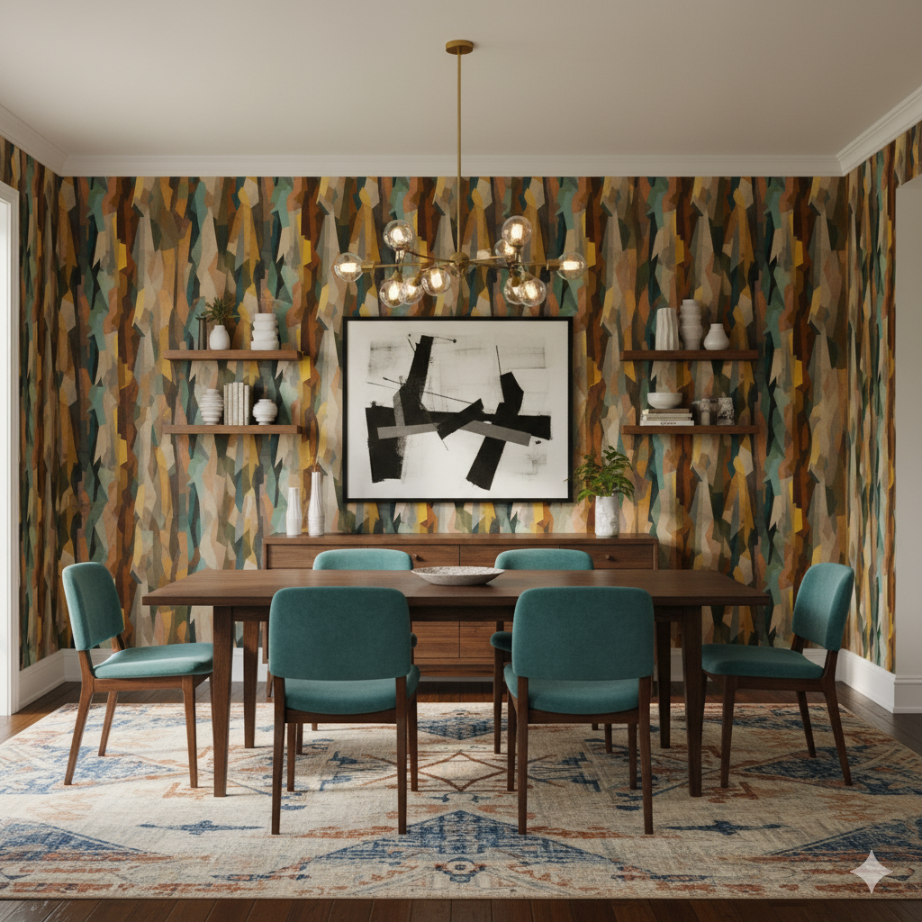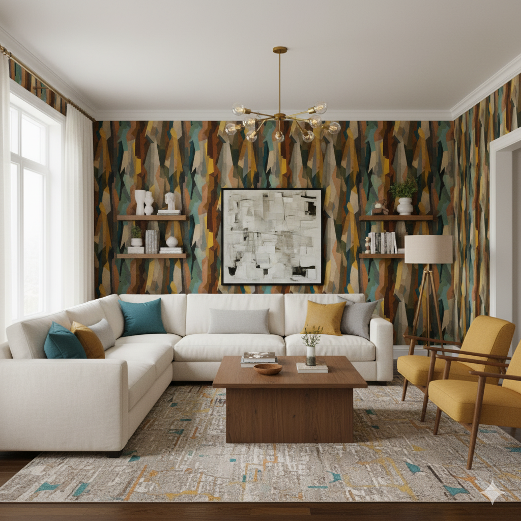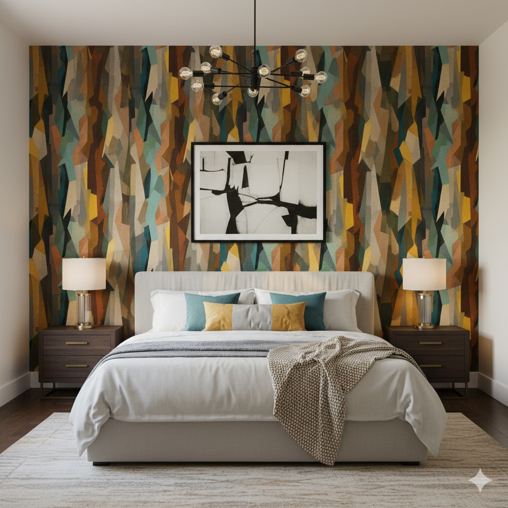 Part skyline, part dreamscape, Fractured Chorus reimagines architecture through a prism of light and motion. Geometric beams slice through muted blues, grays, and rust reds — like sunlight refracting across a futuristic city. It evokes the grandeur of industrial modernism and the quiet poetry of early morning skylines. Perfect for lofts, home offices, or stairwells, this mural-style pattern expands space visually, creating the illusion of movement and perspective. Complement with soft neutrals, white oak, and brushed steel to heighten its cinematic depth.