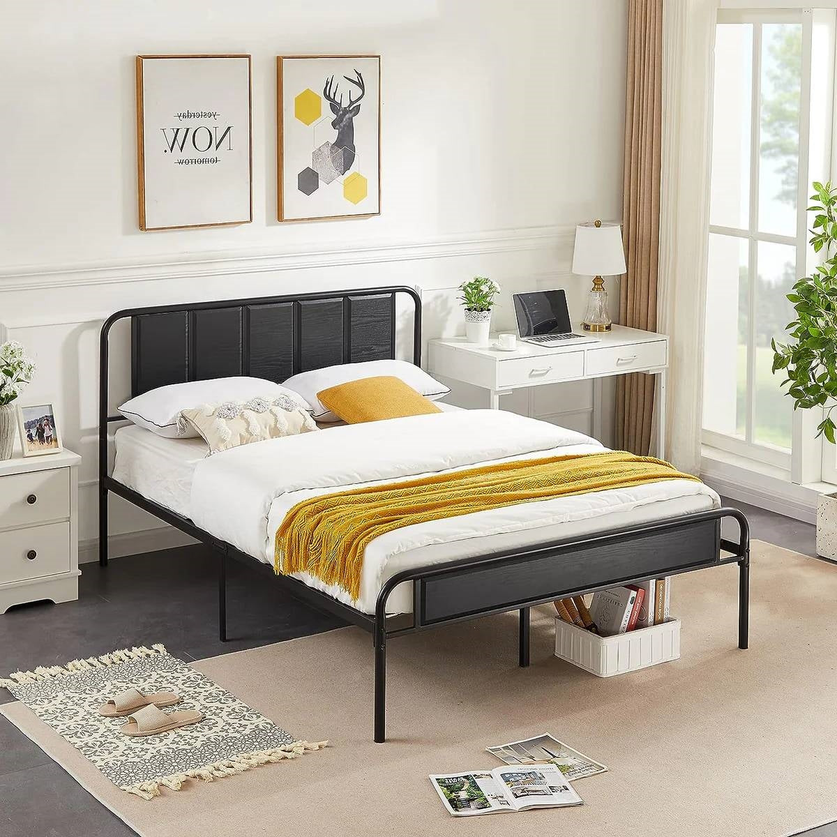 - Full size Black Wood Metal Platform Bed Frame with Rounded Headboard Footboard