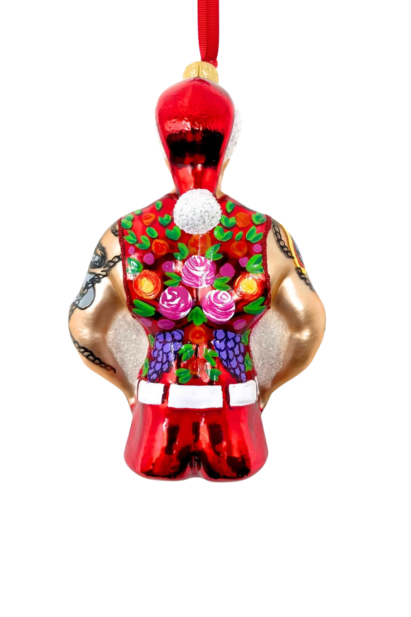 Ditch the sleigh—this Santa rides in with attitude. Muscled arms, tattooed with grit, peek from a crimson vest, while a gold-buckled belt cinches his fearless stance. This is Christmas, unchained—no reindeer, no rules, just raw holiday energy.