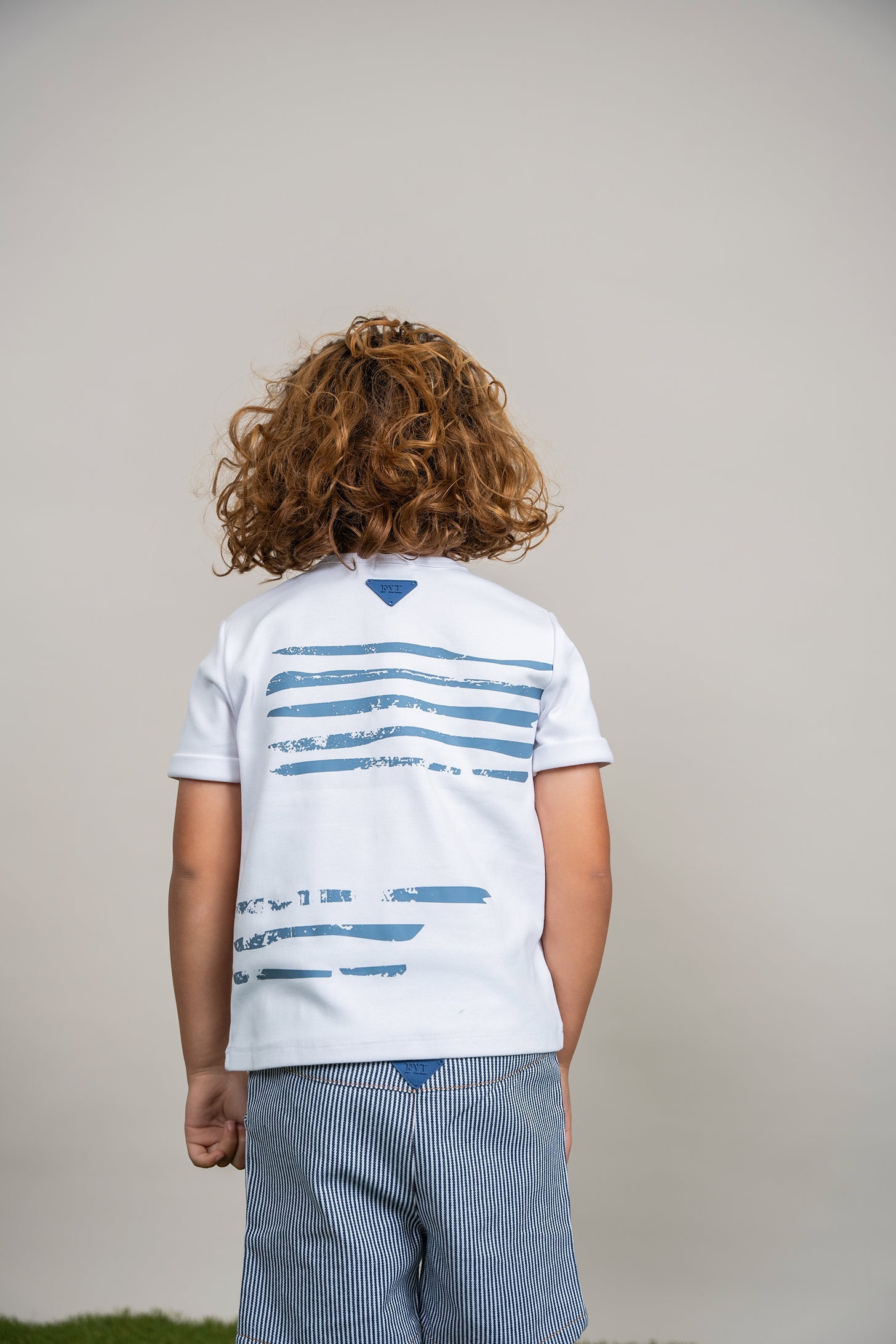 Boys striped denim 2 piece set. Short sleeve soft fine rib top with stripe print and FYI CLUB print at left side bottom. Matching stripe denim short with covered elastic waistband and decorative buttons at front. ֲ