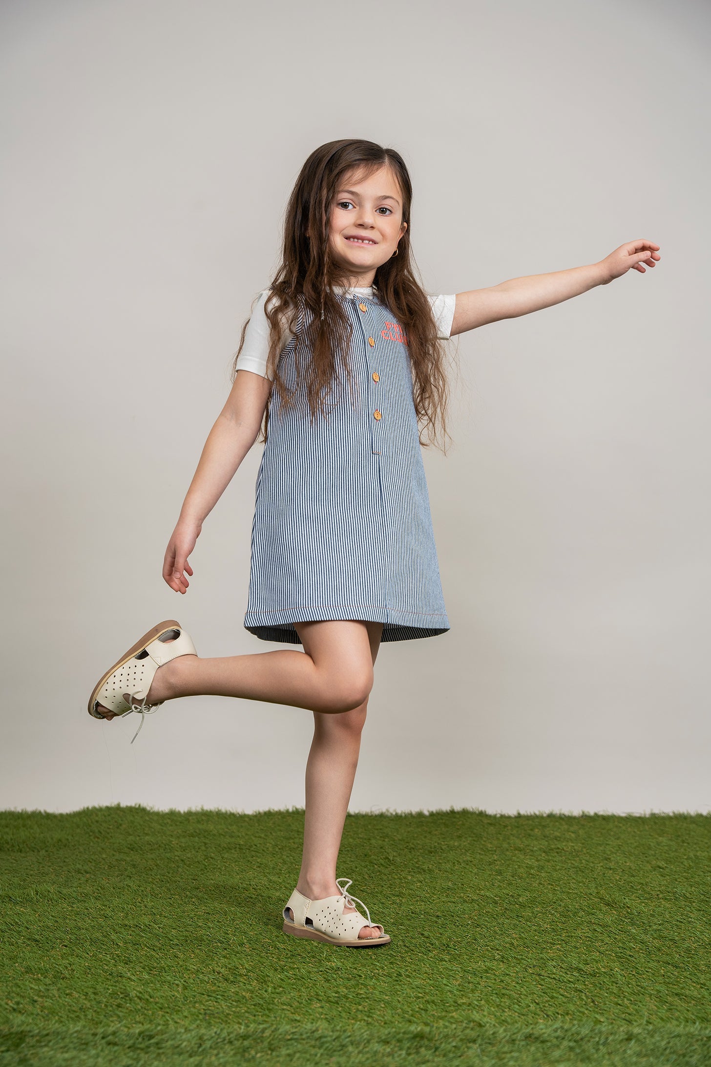 Girls stripe woven denim jumper with center front button opening and FYI CLUB print at left side chest with stripe print at back. ֲ