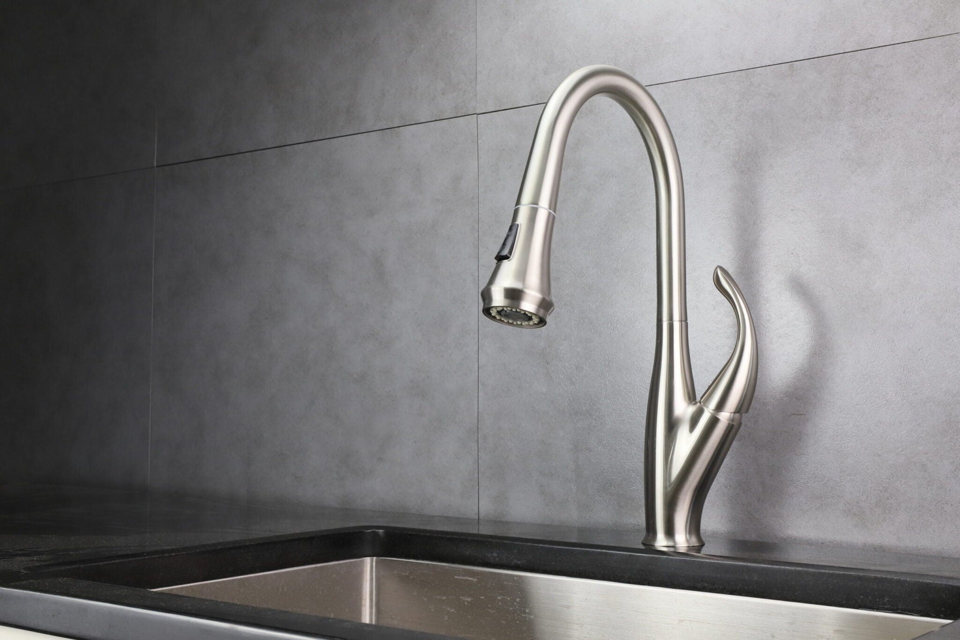 - Modern single-hole kitchen faucet with a brushed nickel finish