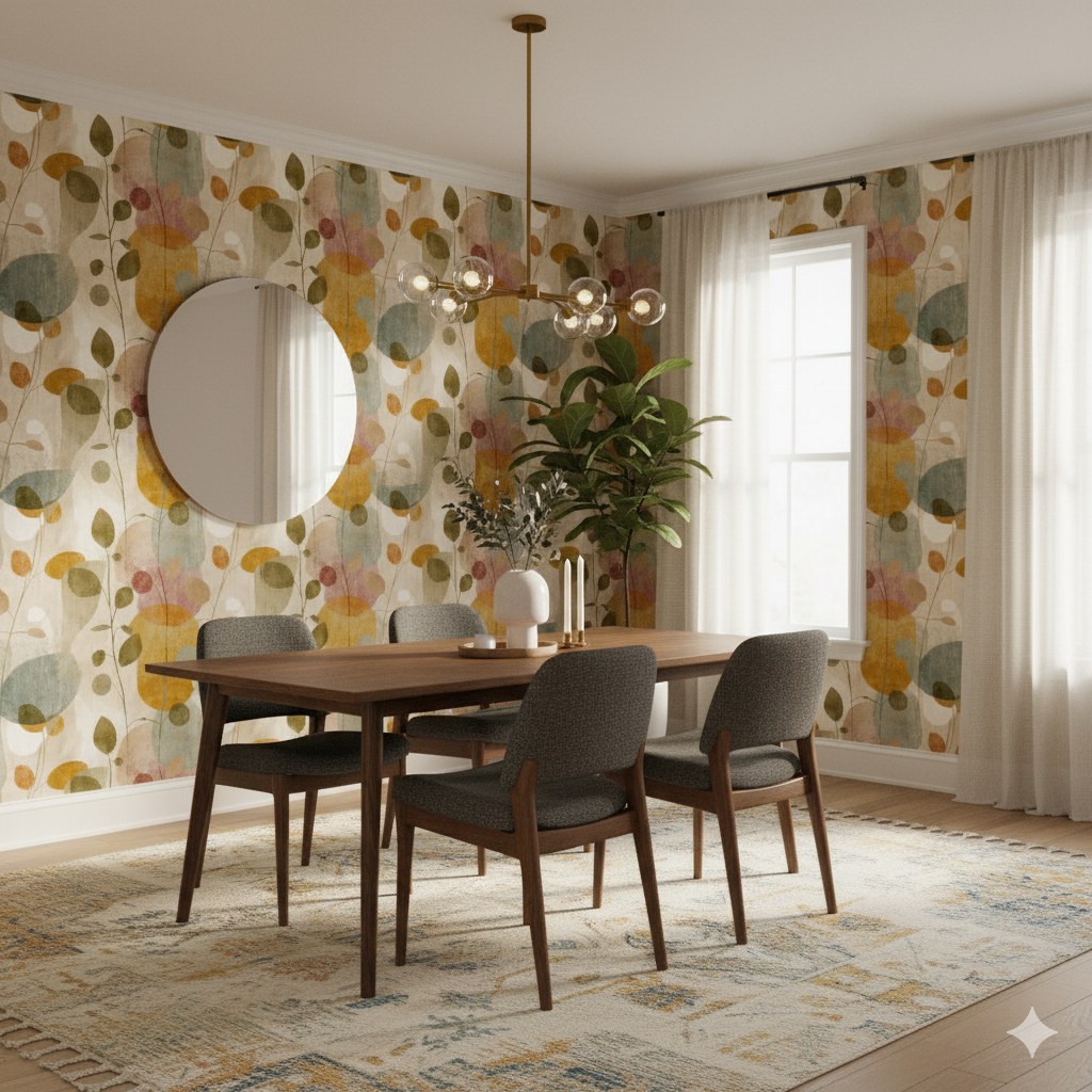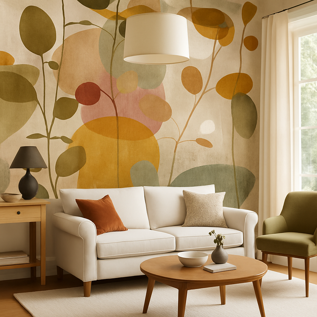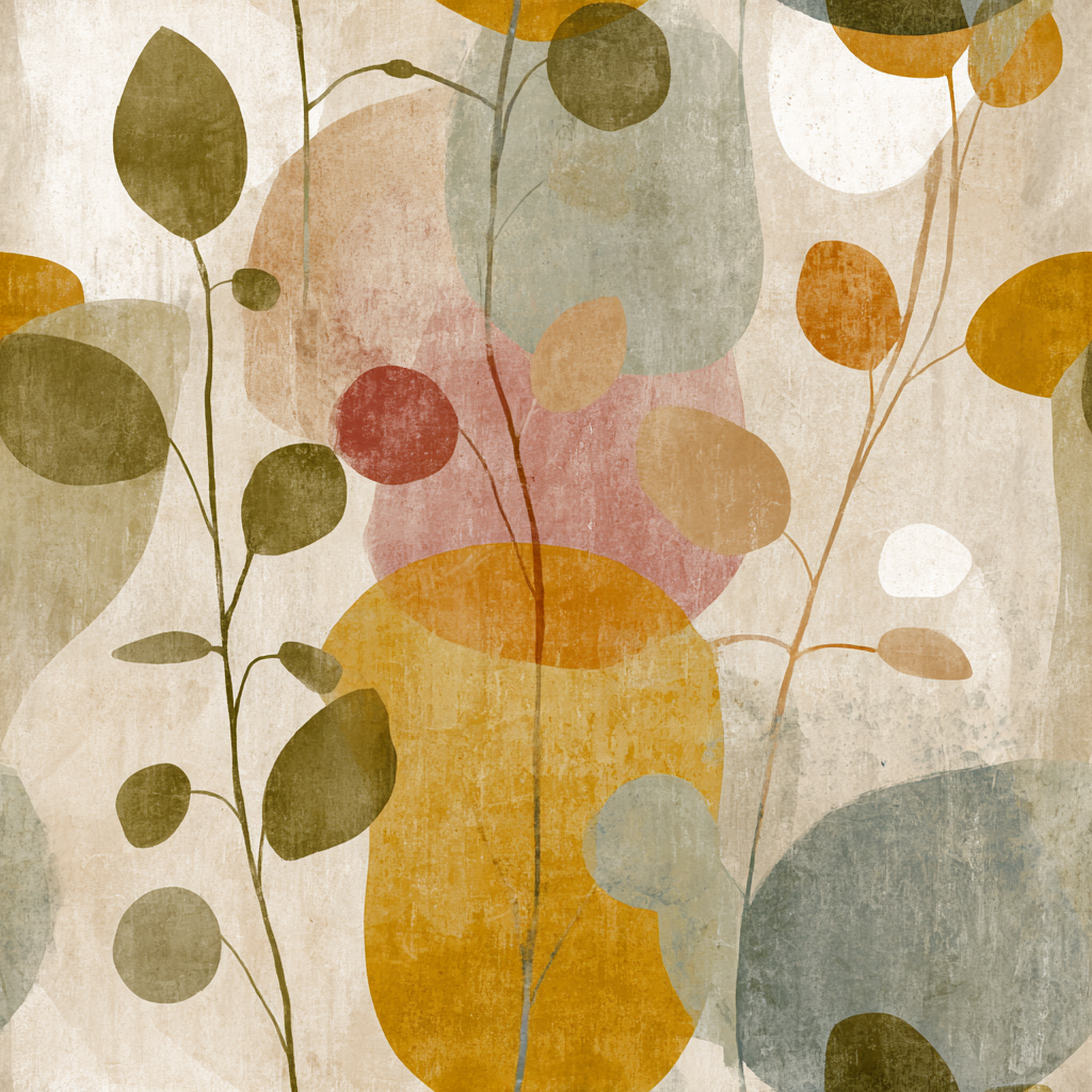 Botanical silhouettes in abstract form. Garden Drift blends muted clay, mustard, olive, and soft green tones with an overlay of floating stems and rounded leaf shapes. The faded painterly textures give it a midcentury-modern-meets-boho feel—perfect for earthy interiors with a creative flair. Use this as a maximalist accent wall in a neutral living room or as a playful yet sophisticated dining nook backdrop. The organic shapes and weathered textures make it an ideal choice for peel and stick wallpaper in eclectic or modern homes.