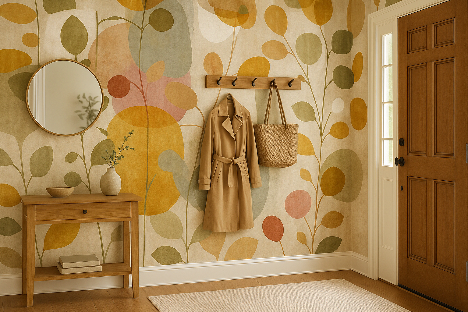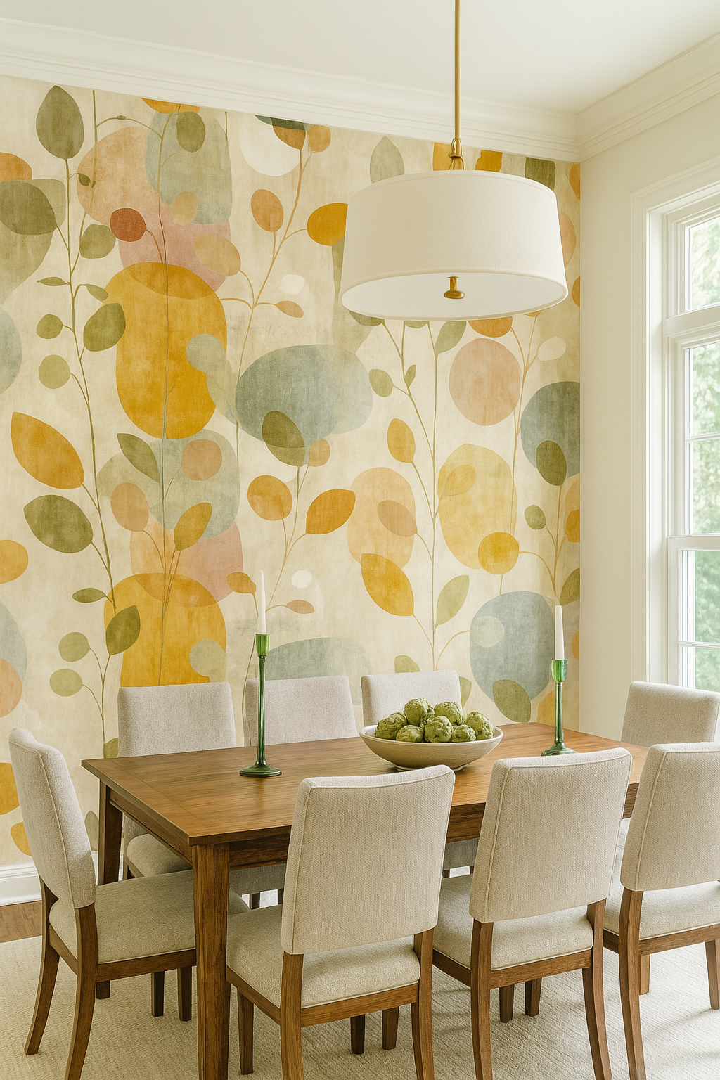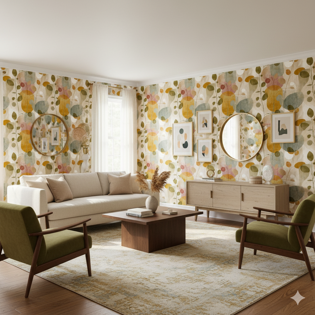 Botanical silhouettes in abstract form. Garden Drift blends muted clay, mustard, olive, and soft green tones with an overlay of floating stems and rounded leaf shapes. The faded painterly textures give it a midcentury-modern-meets-boho feel—perfect for earthy interiors with a creative flair. Use this as a maximalist accent wall in a neutral living room or as a playful yet sophisticated dining nook backdrop. The organic shapes and weathered textures make it an ideal choice for peel and stick wallpaper in eclectic or modern homes.