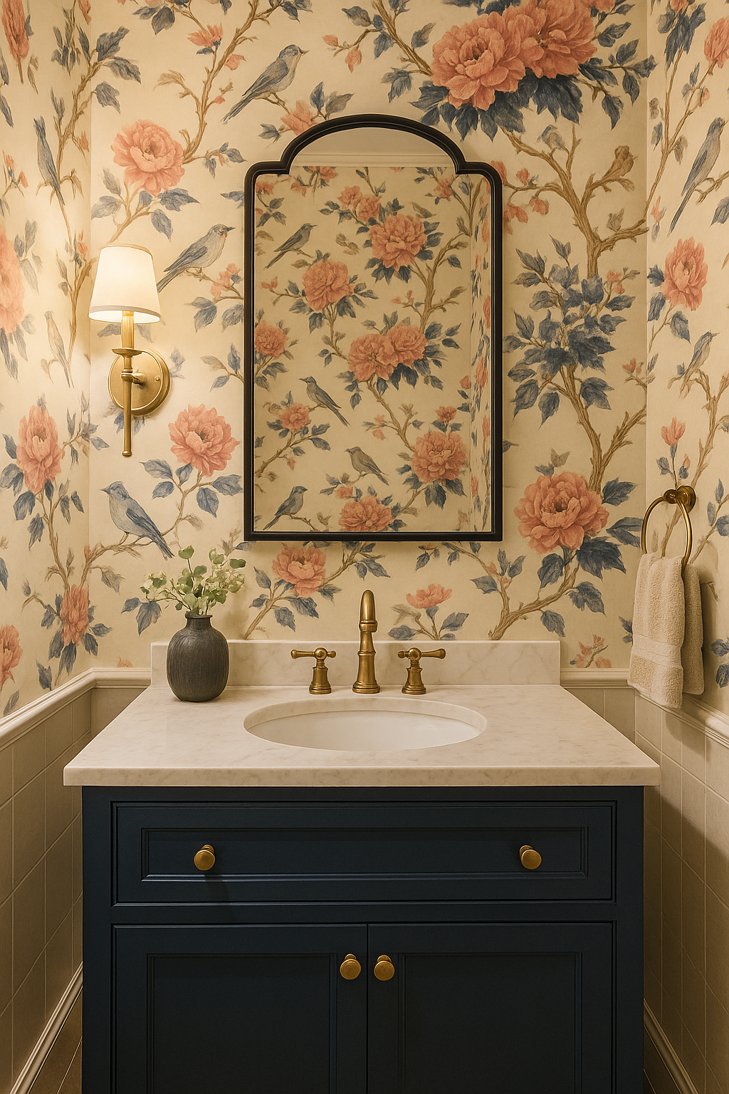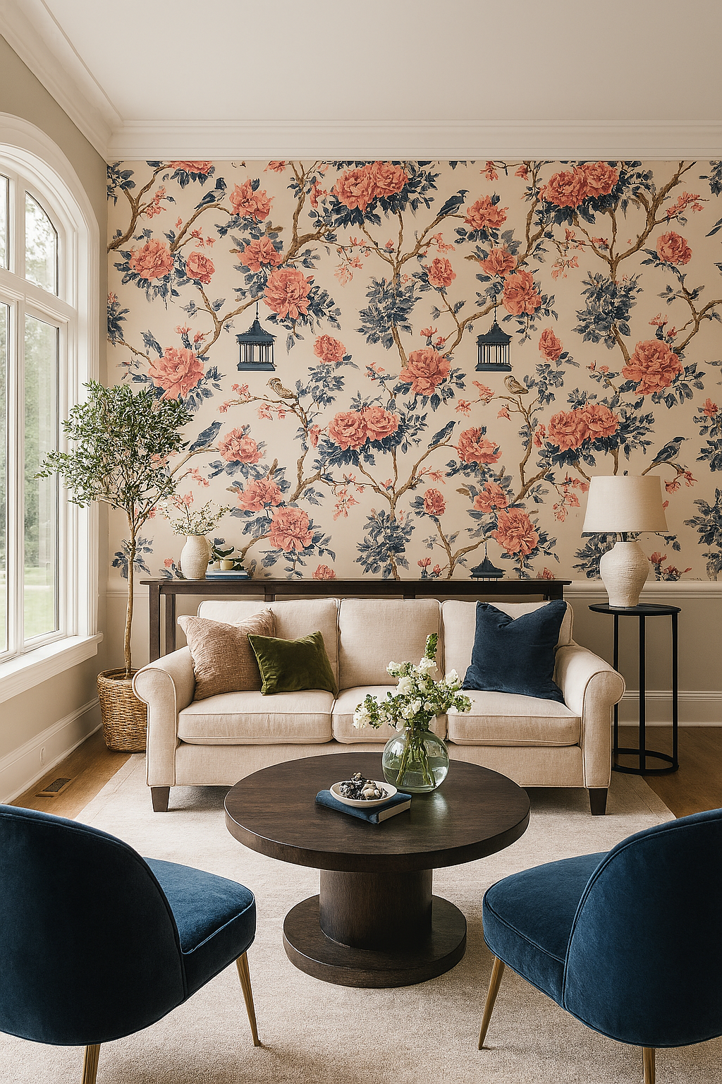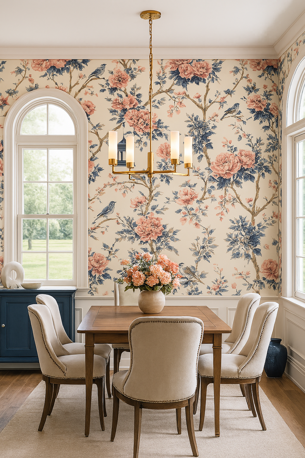 Like something plucked from an 18th-century estate, Garden Songbird features delicate birds, climbing vines, and pagoda details in soft navy and blush against a parchment-toned ground. It’s timeless, storybook-pretty, and loaded with antique elegance—perfect for traditional parlors, vintage guest rooms, or romantic powder rooms with personality.