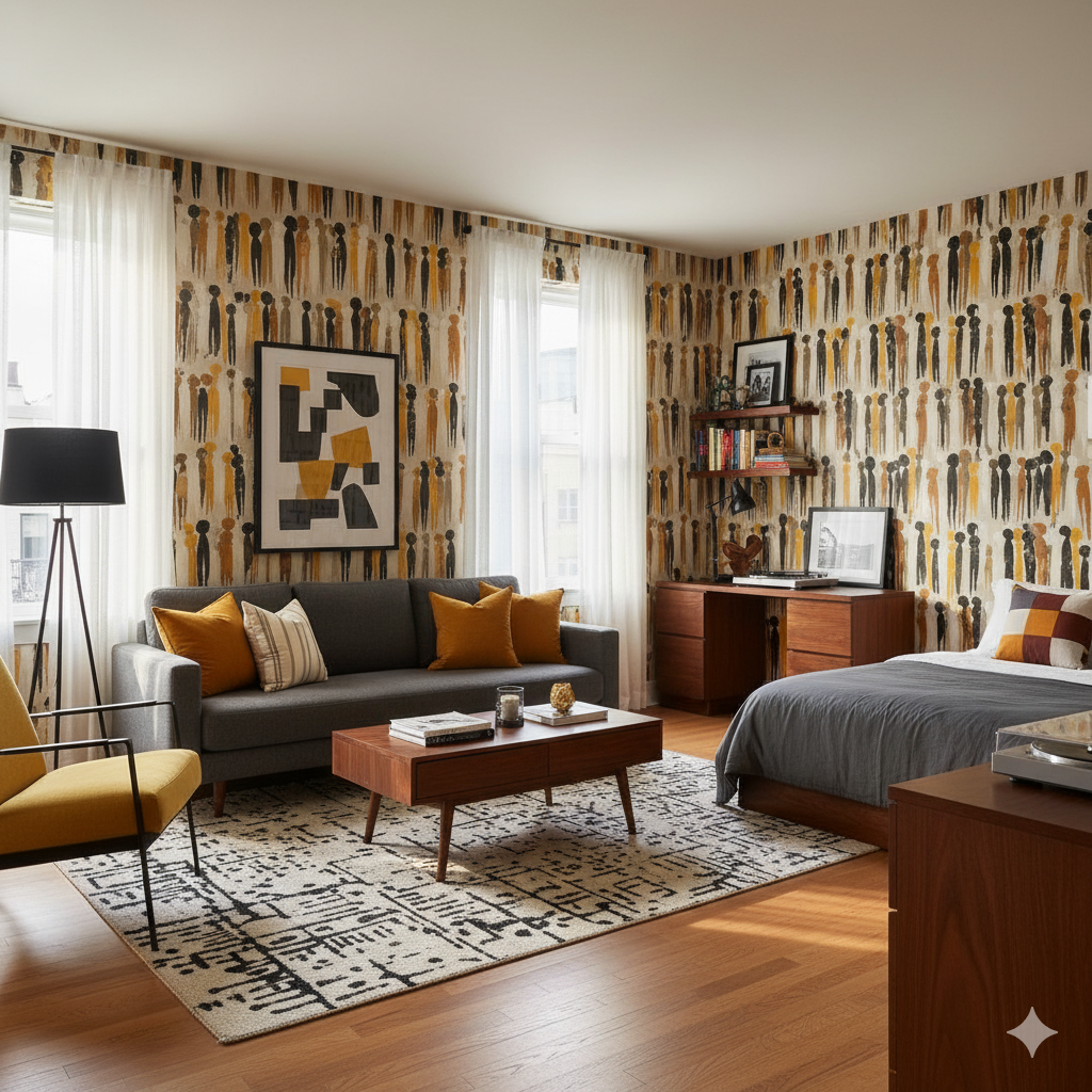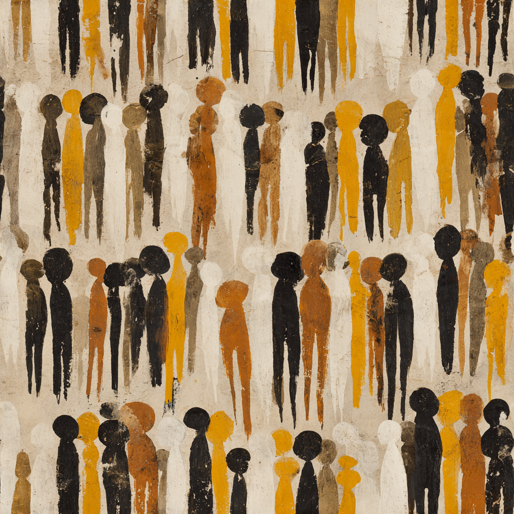 This Primitivist-inspired composition features rhythmic silhouettes of human figures in ochre, black, sienna, and ivory. The forms are simplified — tall, narrow bodies with round heads, arranged in loose rows as if in a communal gathering. The style evokes cave painting traditions while carrying the raw immediacy of mid-century primitivist art. Earthy and textural, the piece resonates with themes of belonging, ritual, and identity. This wallpaper works beautifully in modern lofts, gallery-inspired living spaces, or creative studios. It pairs naturally with raw wood, stone surfaces, and linen fabrics, grounding the room with a sense of timeless human connection.