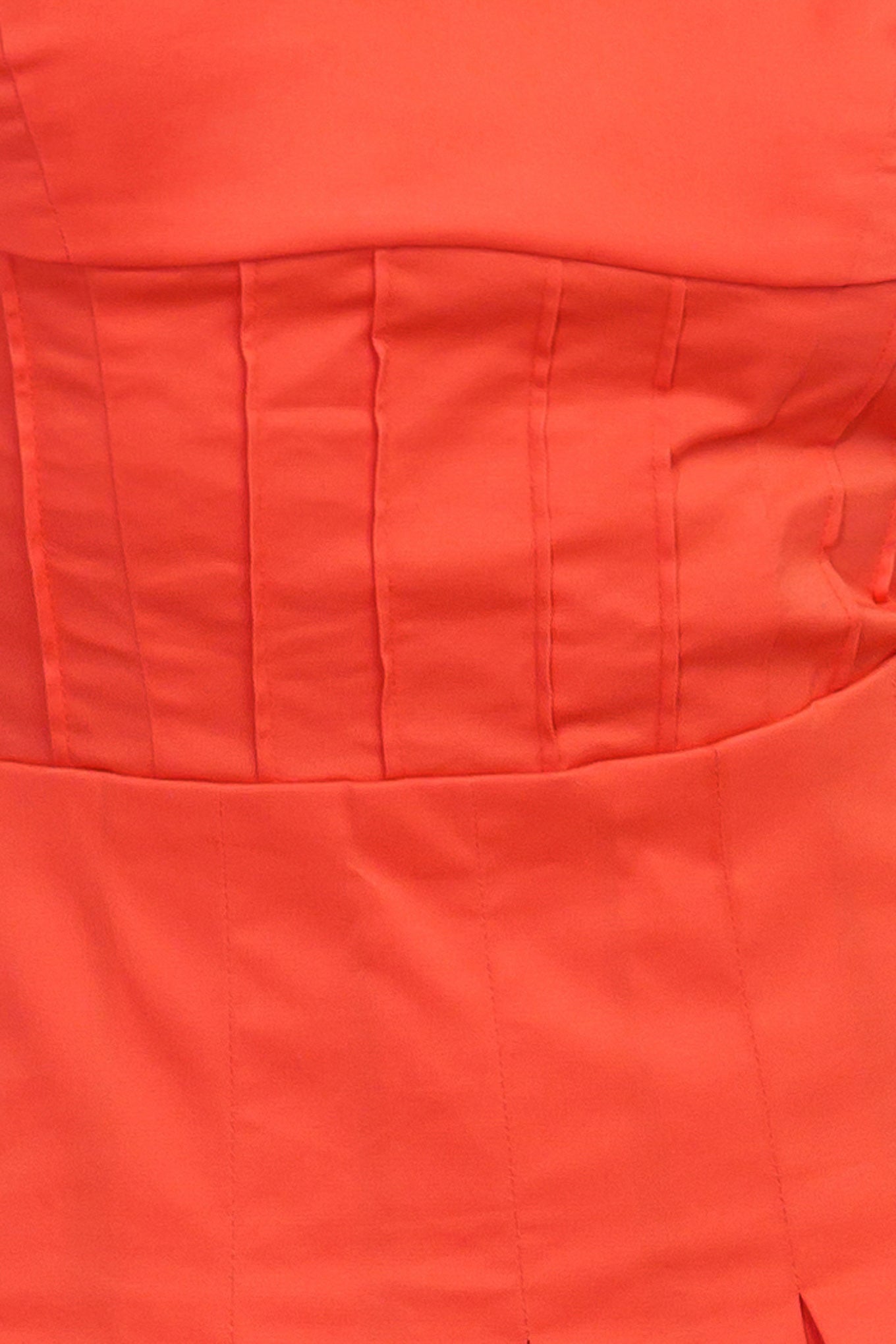 A solid red woven midi dress featuring straight neckline, shoulder ties, pintuck waist, inverted pleated skirt and bare back with straps and zipper closure