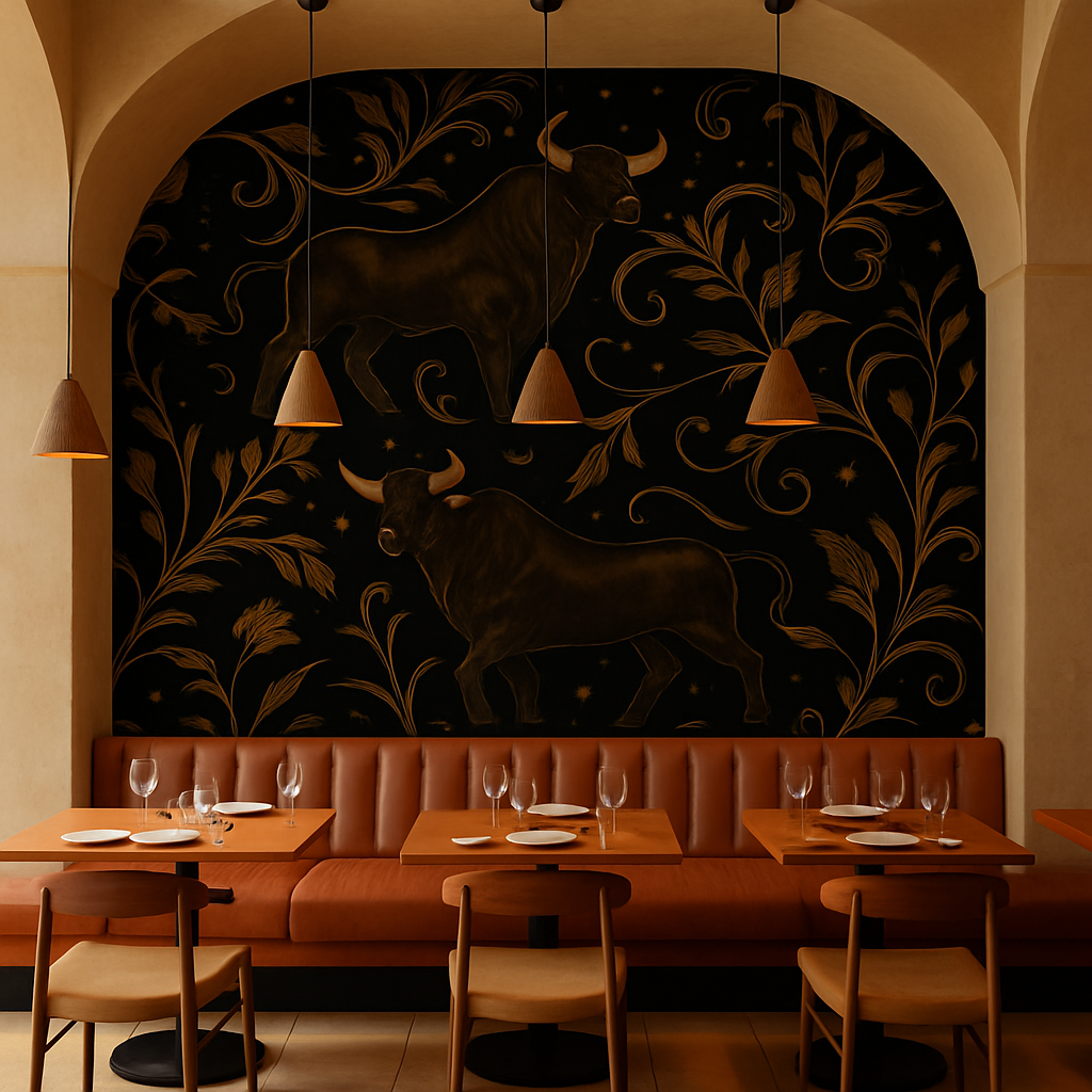 Gilded Taurus is a bold, moody pattern that radiates power and symbolism. Set against a deep charcoal or inky black background, this seamless repeat features stylized bulls — muscular, regal, and rendered in rich, dark tones — surrounded by flowing linework and gilded botanical flourishes. Gold accents glint like constellations, evoking ancient myth and celestial maps. The pattern is balanced and symmetrical, designed to tile smoothly without losing intensity. Perfect for dramatic dining rooms, home bars, or statement alcoves, Gilded Taurus brings masculine elegance and grounded energy to refined interiors.