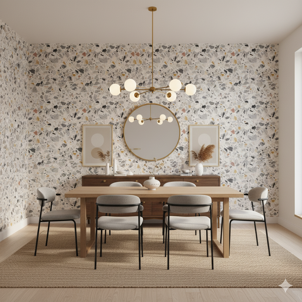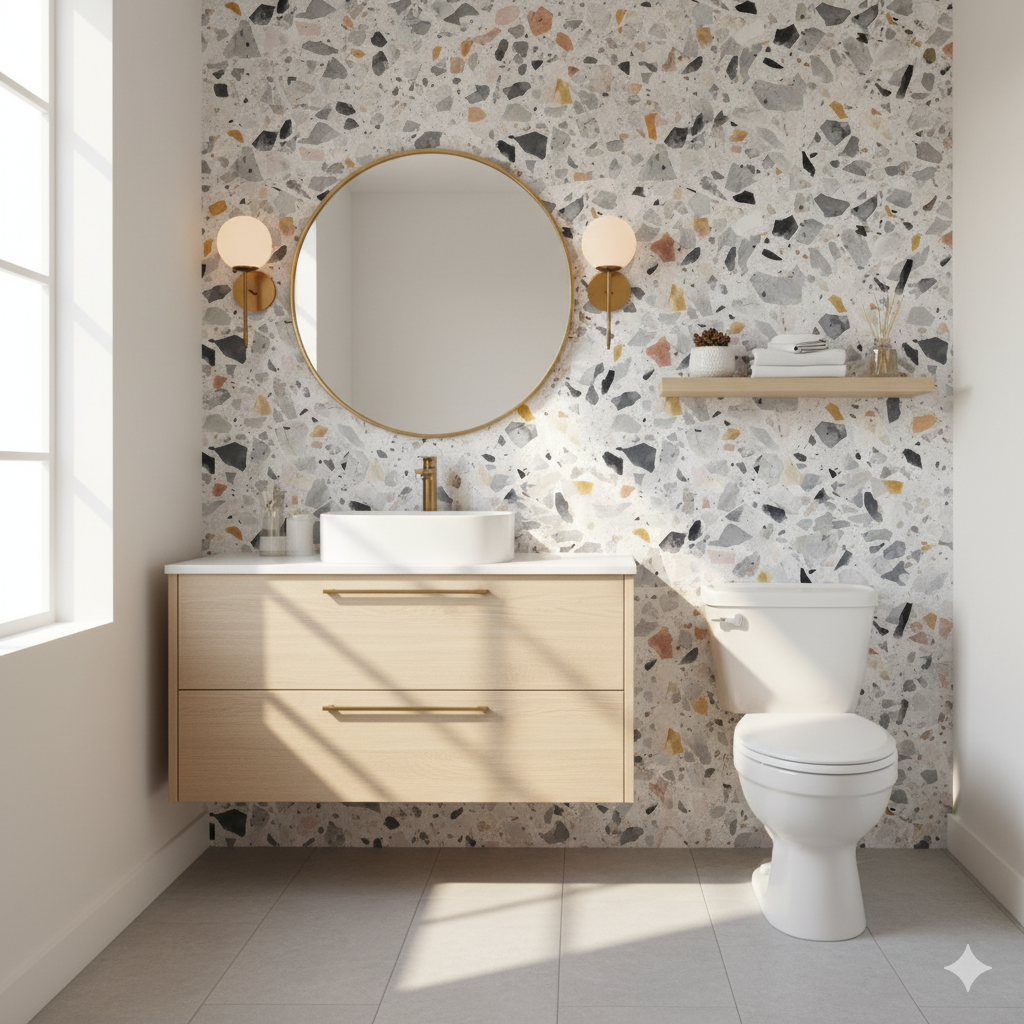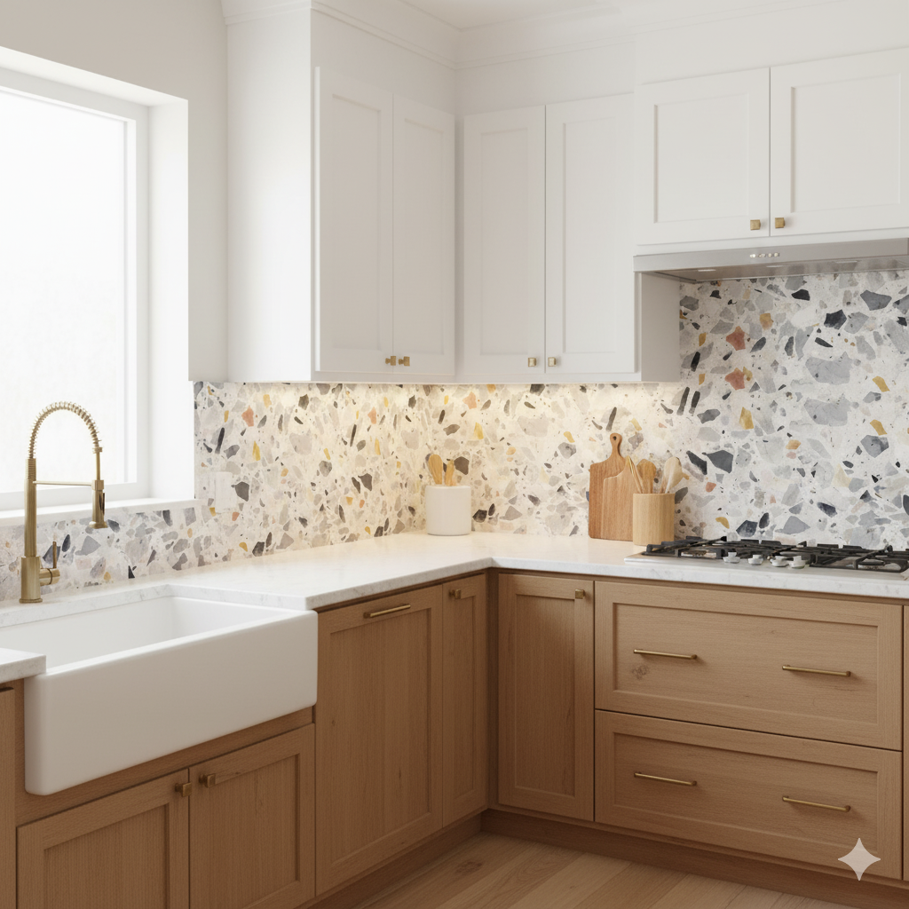 Sharp terrazzo shards in icy grays, inky blacks, pale blush, and ochre gold are embedded in a speckled white ground, resembling freshly fractured stone set into polished concrete. It has a modern, urban character while maintaining the timeless appeal of terrazzo. Its cooler palette makes it especially suitable for contemporary kitchens, spa-inspired bathrooms, or minimalist loft spaces. Paired with marble counters, matte black fixtures, or light woods, it provides an elevated yet versatile backdrop that feels both sleek and enduring.