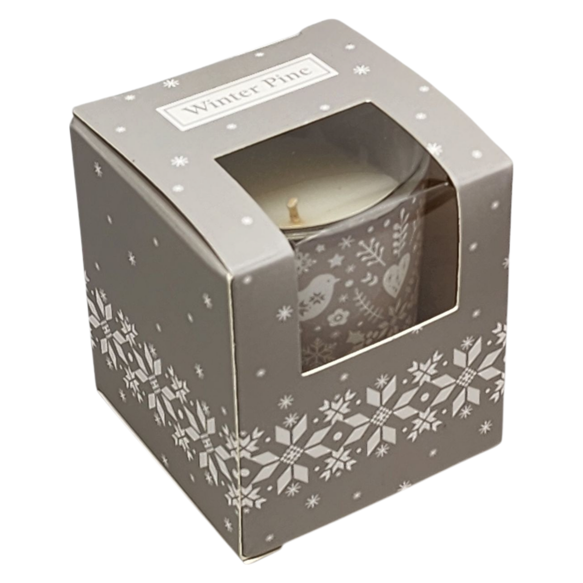 Transform your home into a winter wonderland with the Winter Pine Candle! This delightful votive candle, housed in a beautifully designed reusable glass holder, offers a cozy ambiance and a soothing scent that embodies the essence of the season. The candle itself is 1.75 ounces and gives off a comforting Winter Pine aroma, reminding you of relaxing walks through a snow-covered forest. With an approximate burn time of 10 hours, it's perfect for long winter evenings or holiday gatherings.