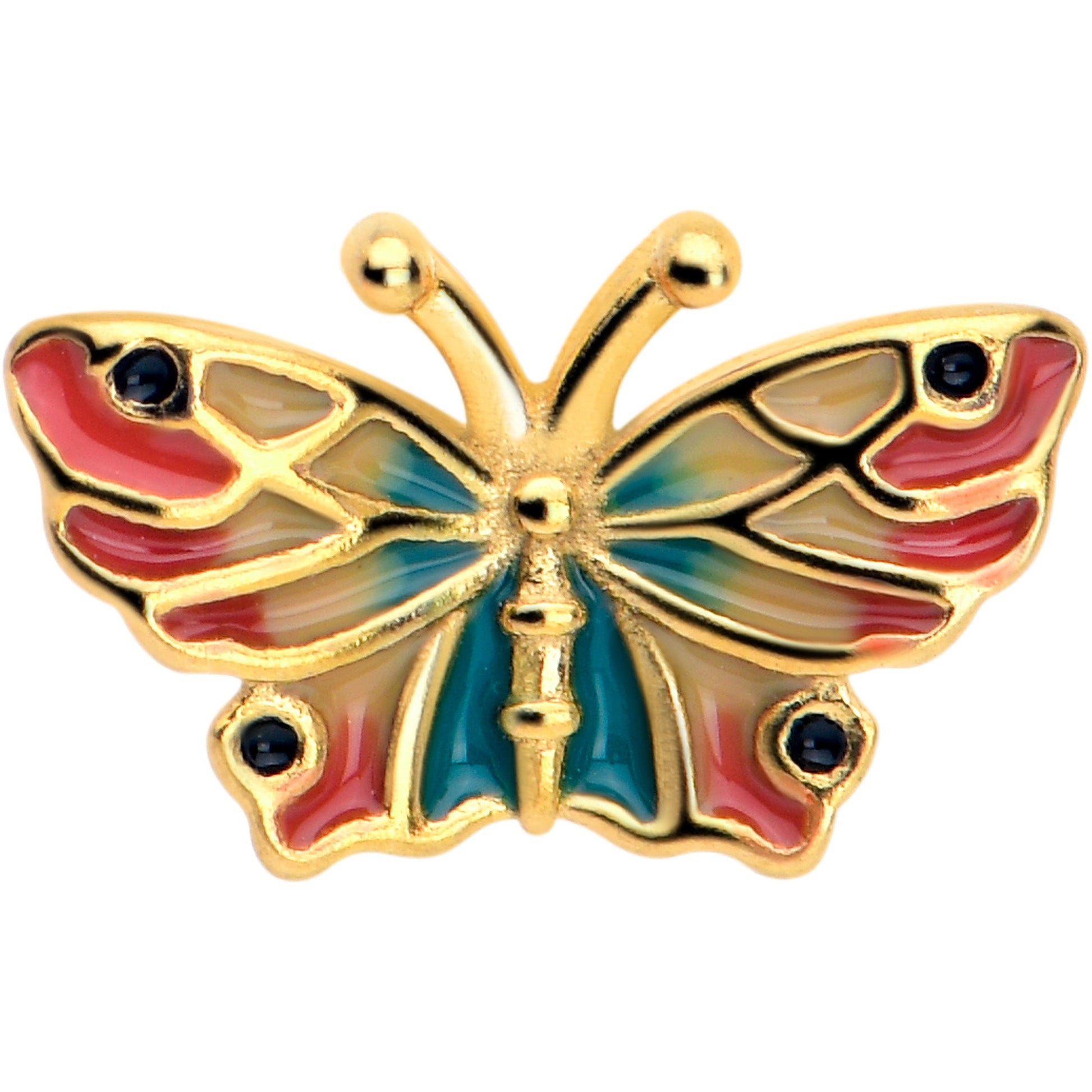The butterfly on this 14 gauge tongue jewelry is rocking all the colors of the morning sky. It is made with a 5/8 inch gold tone PVD over 316L surgical grade stainless steel straight barbell with a 6mm bottom ball end. The top end features a butterfly charm. The butterfly has wings inlaid in shades of red, orange, and blue for a look that truly wakes things up. Grab your coffee and spread your wings, it is time for style with this beautiful butterfly tongue piercing ring.Specifications