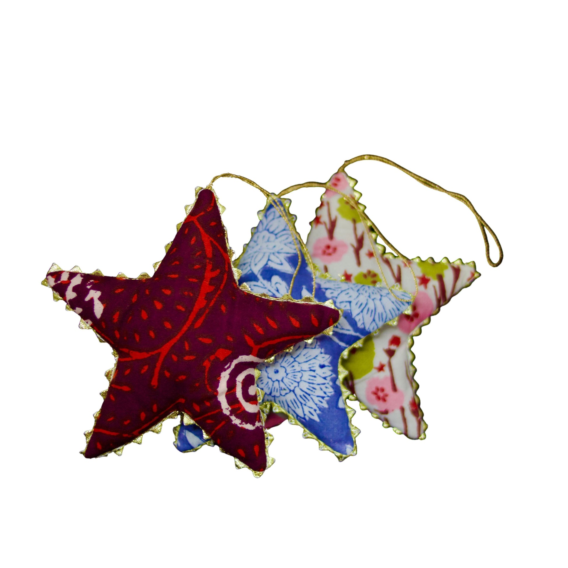 These little star ornaments are so popular we decided to give them a bit of a new twist. We chose bold fabric that was screen-printed by hand in Jaipur, and added a glitzy foil trim.These ornaments are bright and fun, and definitely not just for the holidays!