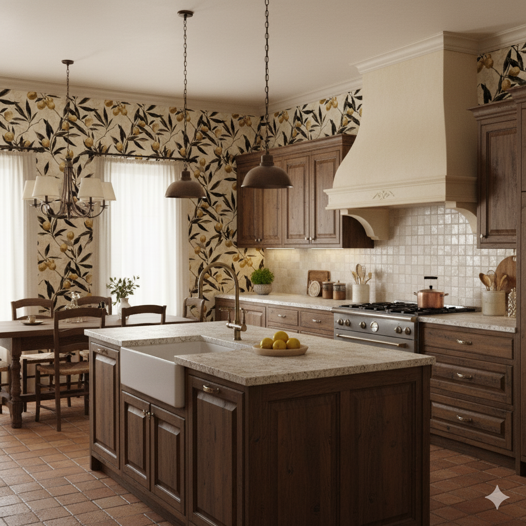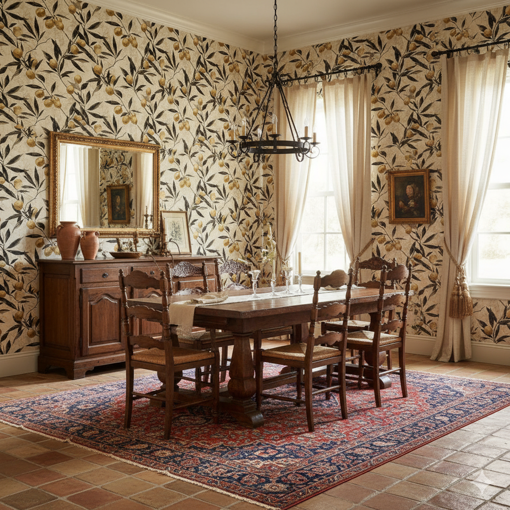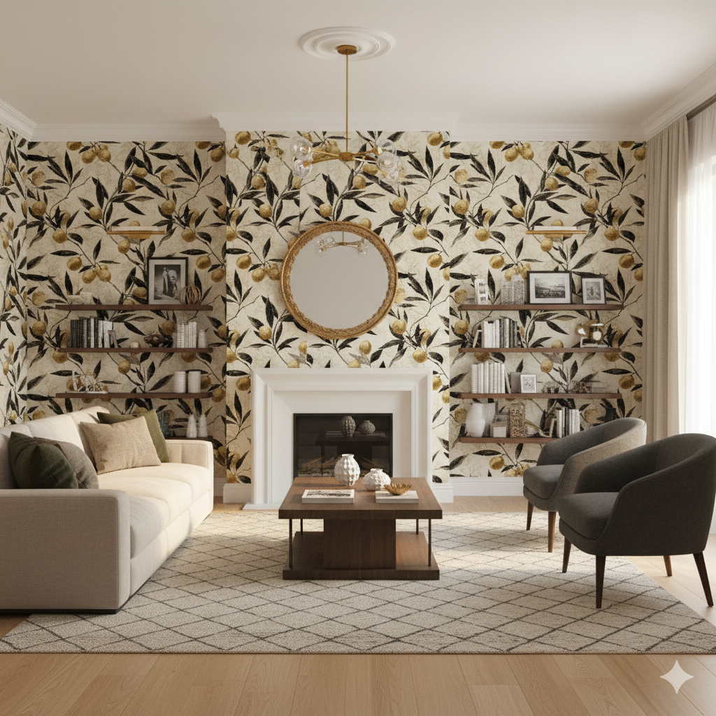 Mediterranean warmth radiates from this wallpaper of golden citrus fruit clustered among inky black leaves. Each branch feels hand-etched, with delicate linework that recalls vintage botanical illustrations, while the glowing fruits appear almost gilded against the parchment-toned backdrop. The design strikes a balance between rustic charm and refined artistry, offering a look that feels both timeless and contemporary. Golden Citra thrives in kitchens, sunrooms, or wine bars where it can evoke old-world European charm. It’s equally at home in modern farmhouse dining rooms or eclectic interiors where heritage-inspired prints are layered with contemporary furniture. Its balance of sophistication and organic warmth ensures it resonates in spaces that want both history and liveliness.