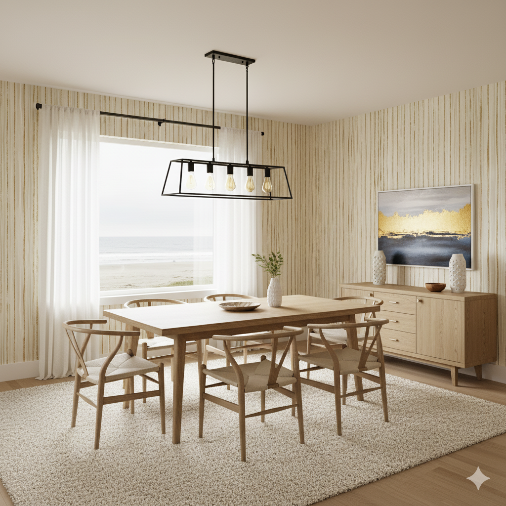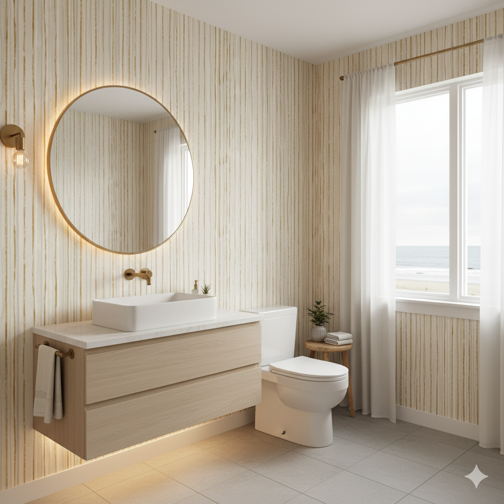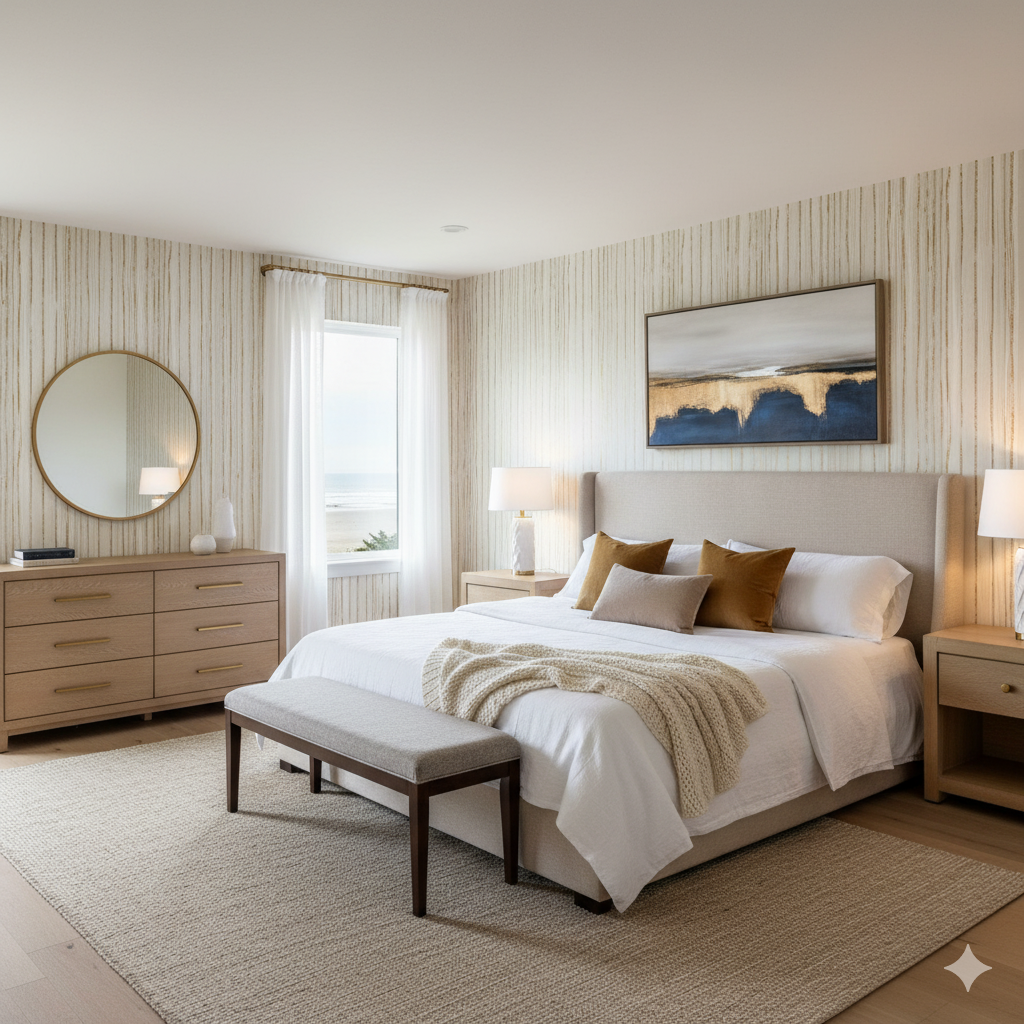 Warm ivory and cream tones are streaked with gold verticals, evoking sunlit drapery or delicate grasses catching morning light. The subtle painterly effect balances elegance with earthiness, making it adaptable across a range of interiors. This wallpaper fits seamlessly into modern transitional spaces, bedrooms with neutral palettes, or sophisticated living rooms. Pair with natural oak, brass accents, or soft beige textiles for an elevated but approachable aesthetic.