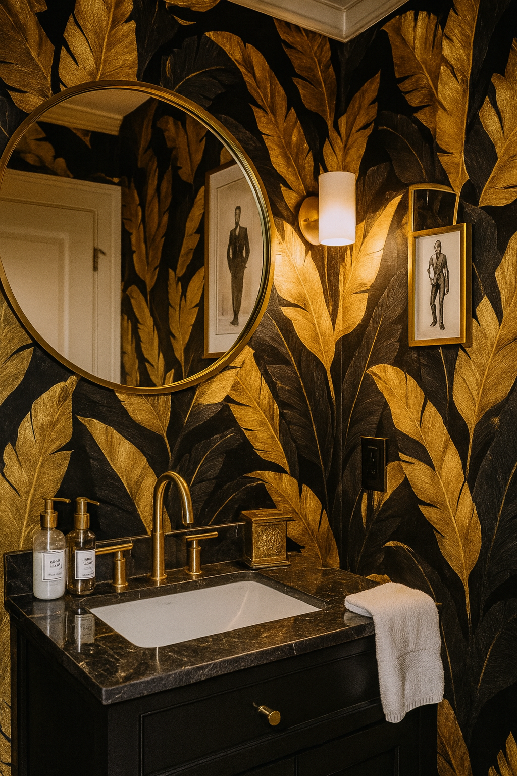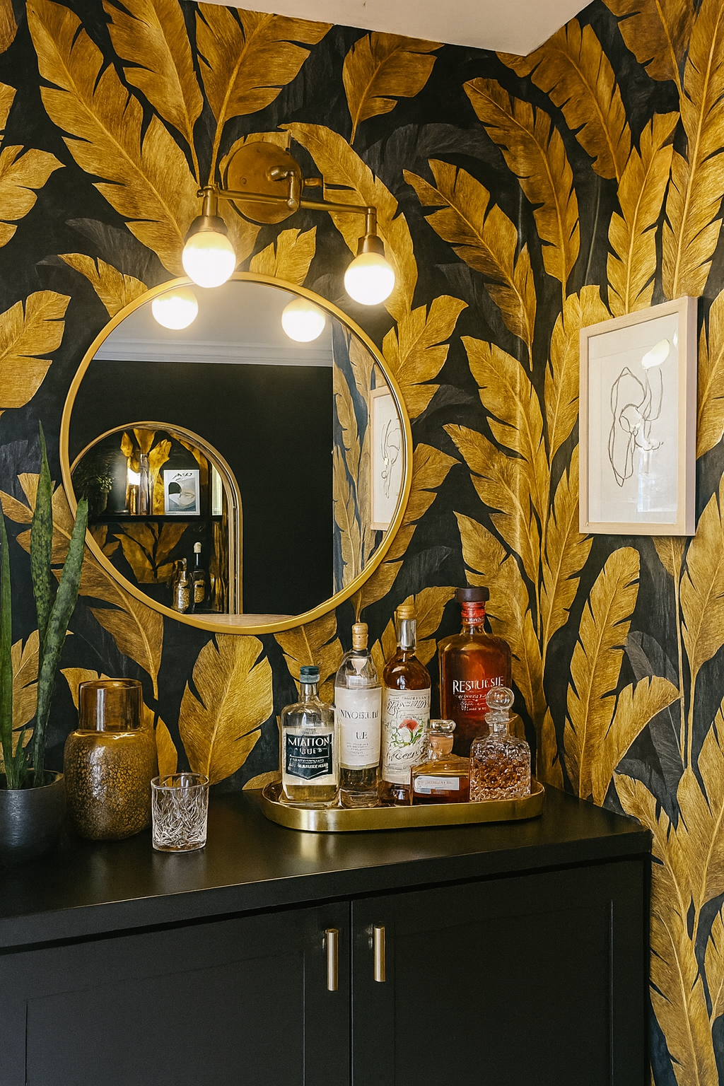 Banana leaves and palm fronds are reimagined in Golden Tropic, a bold botanical with oversized, stylized foliage rendered entirely in brushed gold against an inky black backdrop. The high-contrast palette creates luxury with a wild side—perfect for opulent bedrooms, high-end retail spaces, or tropical-inspired lounges with a dark twist.