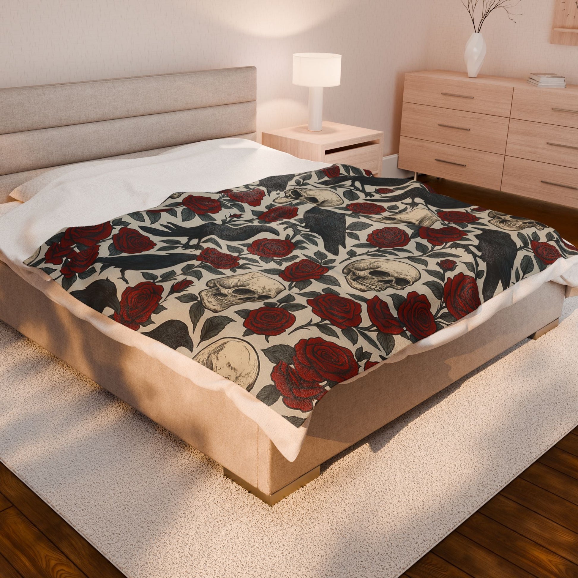 She is Selene Nocturne — The Grave Bloom—roses and skulls entangled, shadow softened into warmth. The Gothic Skull Rose Blanket cloaks her duality: gothic comfort draped in rebellion.