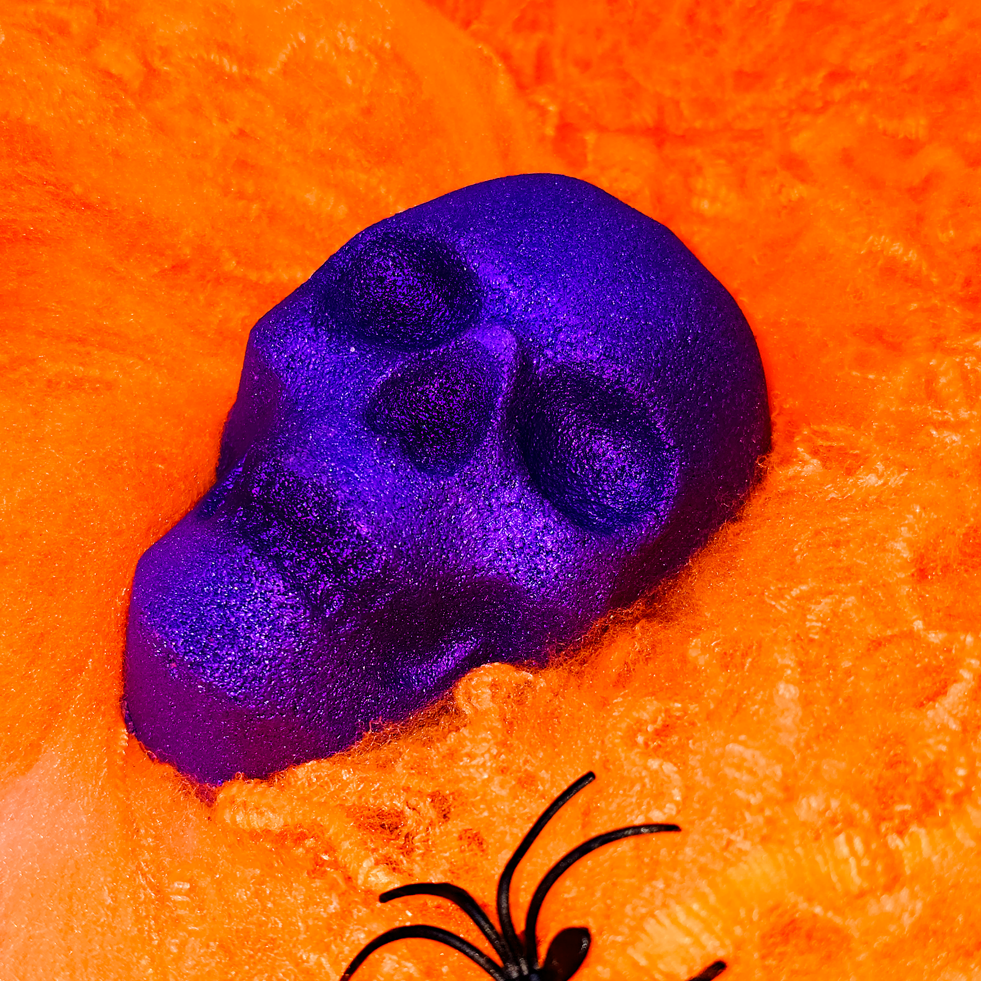 Unwind with our fizzy purple handmade skull bath bomb for a hauntingly relaxing soak.