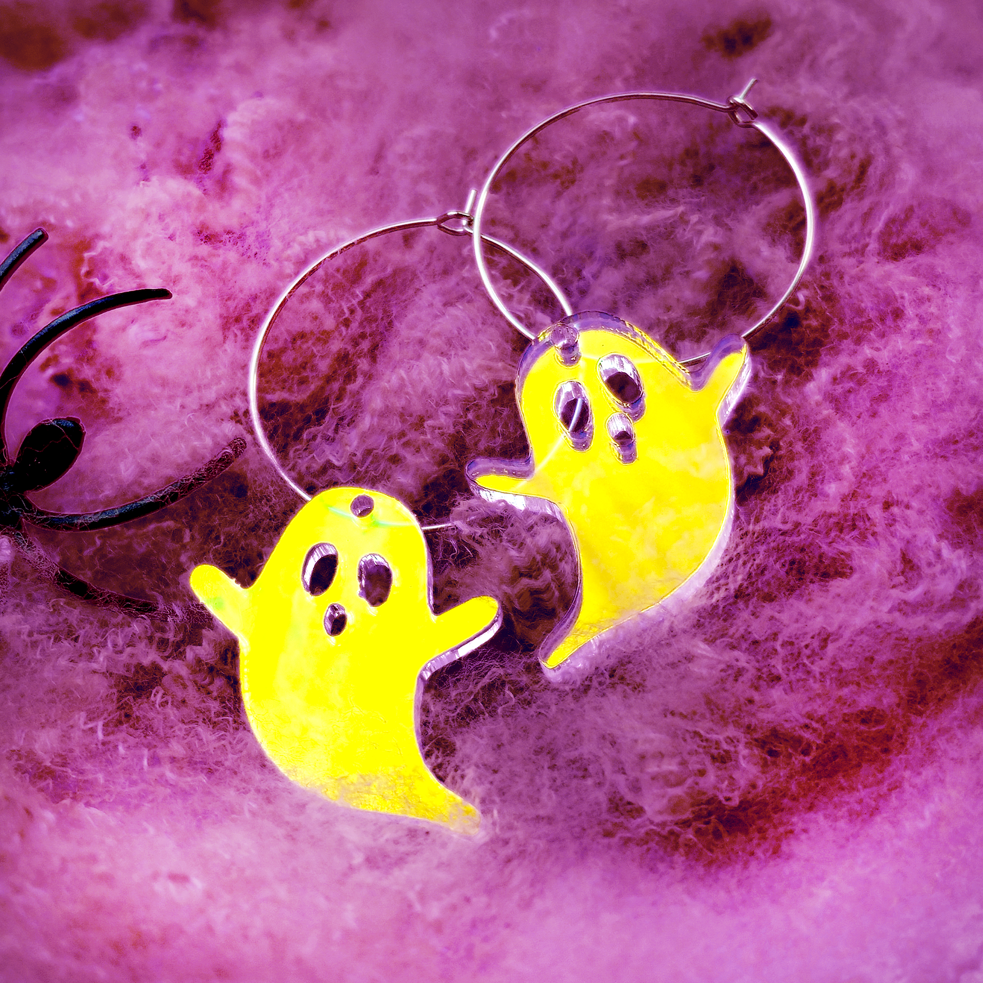 Finally, add a ghostly touch to your outfit with a pair of hour handcrafted iridescent ghost dangle earrings on stainless steel hoops—hypoallergenic and fabulously frightful.