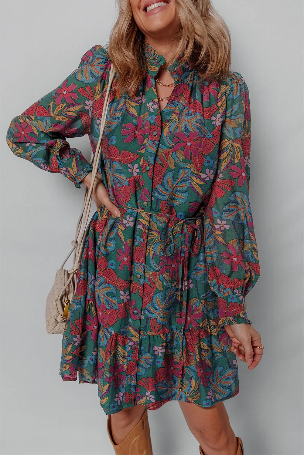 - Embrace nature with the mini dress, featuring a V-neck and puff sleeves for a playful yet elegant look.