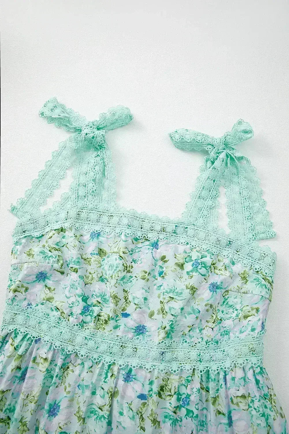 - Exude femininity in our Maxi Dress, featuring a boho-chic design with delicate floral lace details in a soft green hue.
