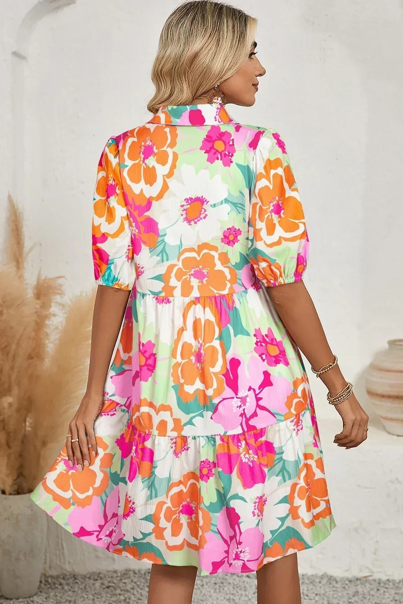 Green Floral Puff Sleeve Buttoned Babydoll Dress