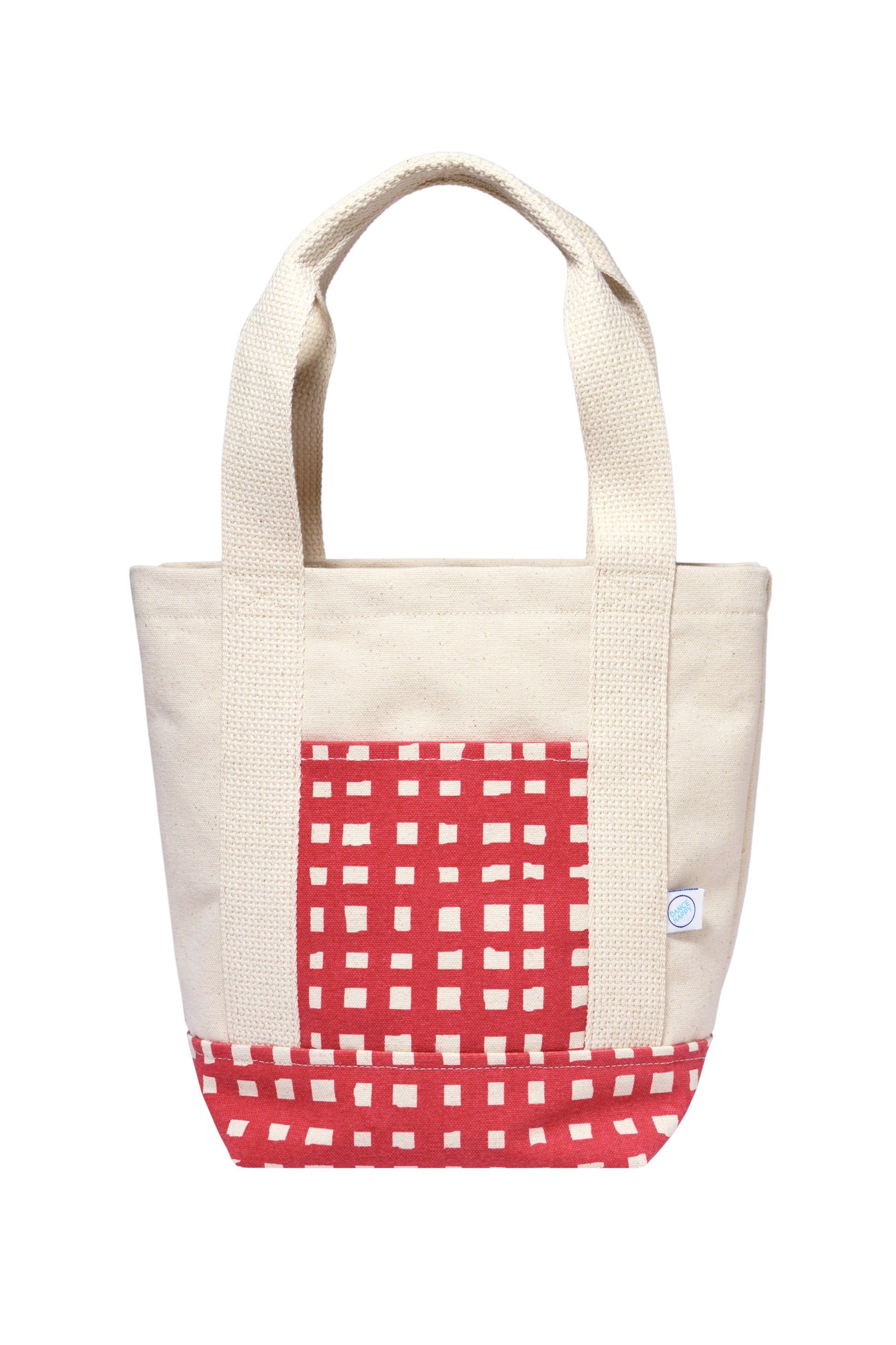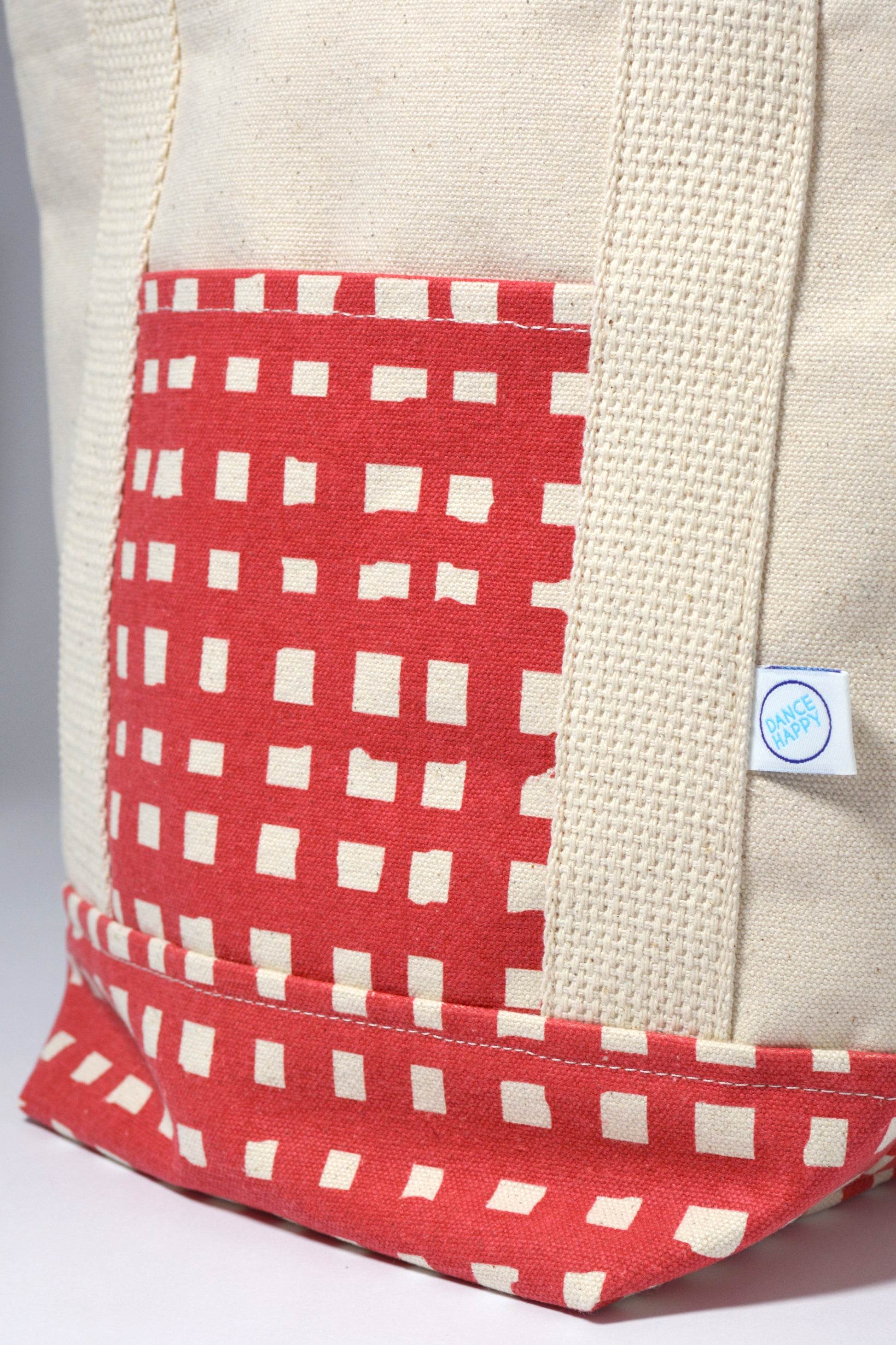 Sized at 12.5" wide by 11" tall with a 6" gusset and a 7.5" handle drop, this mini tote bag fits just right—never bulky, always ready. Made from 100% cotton canvas, it features a hand painted dot pattern that's screenprinted in coral.