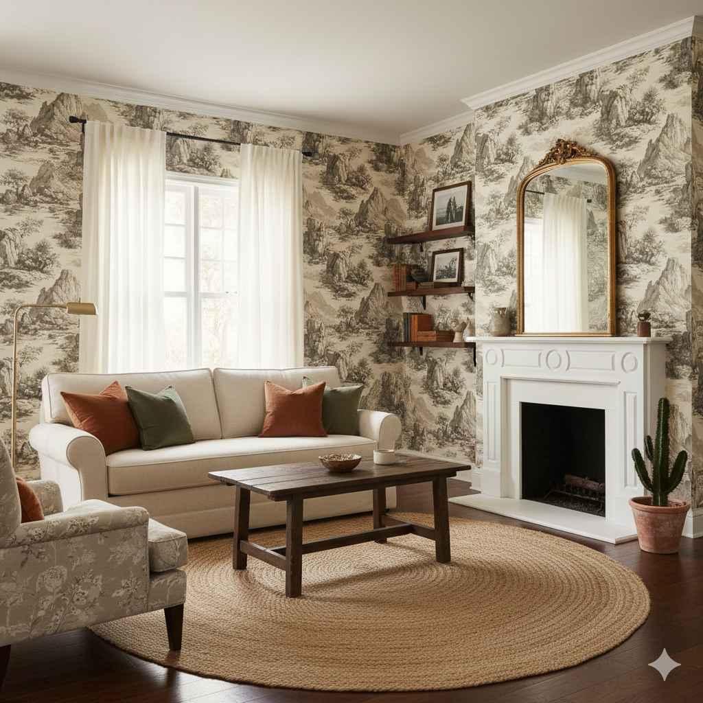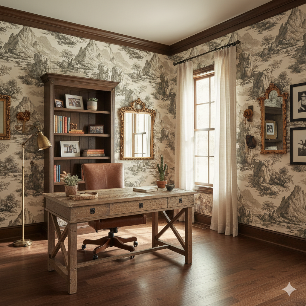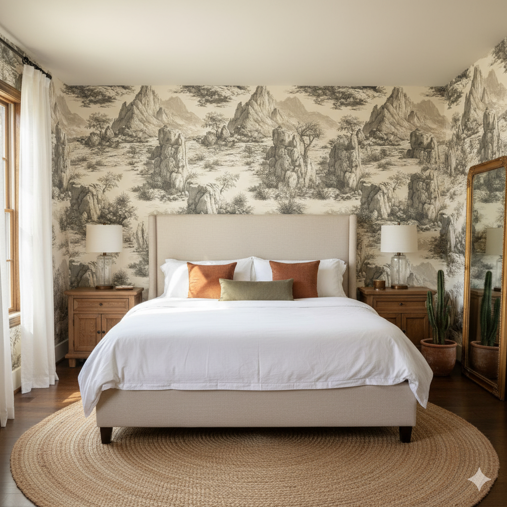 A detailed black-and-white engraving-style pattern depicting the dramatic cliffs and flora of the Guadalupe Mountains. Every rock face, yucca plant, and rolling horizon is etched with precision, giving the wallpaper a timeless, historical quality. With its classic toile sensibility, it feels equally at home in ranch houses, heritage properties, or modern minimalist interiors seeking contrast. Ideal for accent walls, dining rooms, or even boutique retail settings, this wallpaper resonates with anyone looking for landscape toile, desert mountain wallpaper, or Western heritage design.
