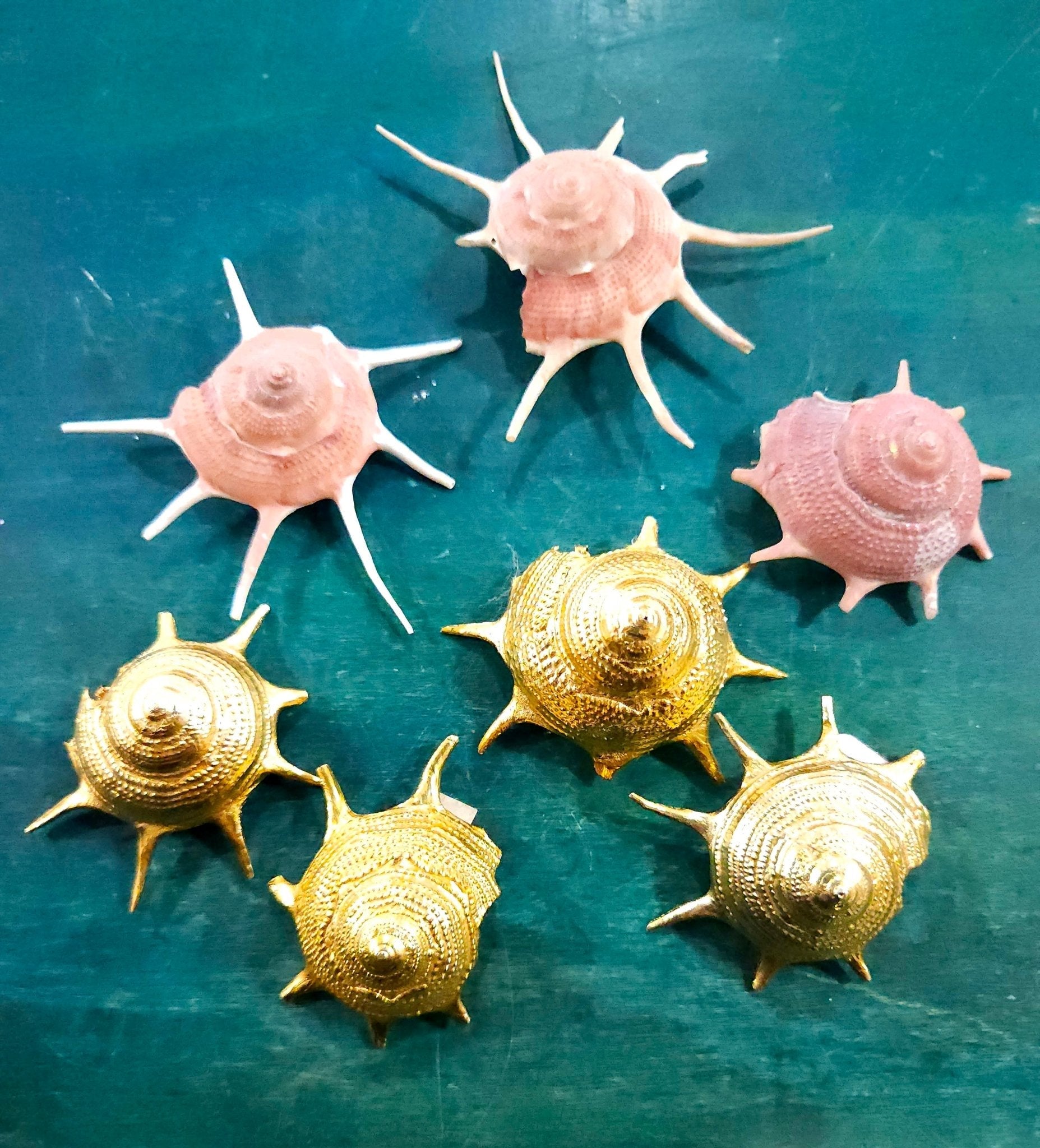 This Beautiful "star" shell is vibrant with color and rarity, lined with pink and pearl colored accents. . These delicate shells are a special addition to any collection with intact spines or slightly damaged, your choice!
