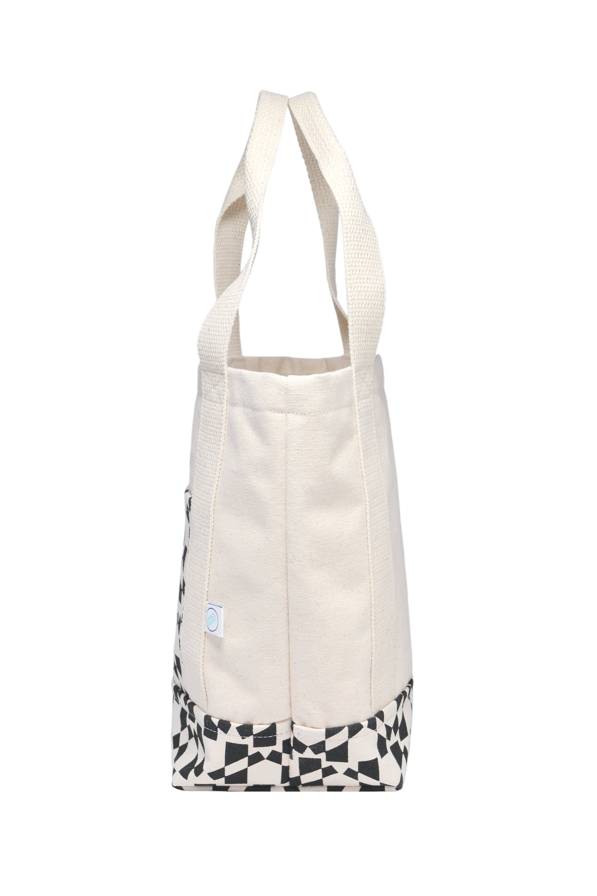 Sized at 12.5" wide by 11" tall with a 6" gusset and a 7.5" handle drop, this mini tote bag fits just right—never bulky, always ready. Made from 100% cotton canvas, it features a hand painted dot pattern that's screenprinted in coral.