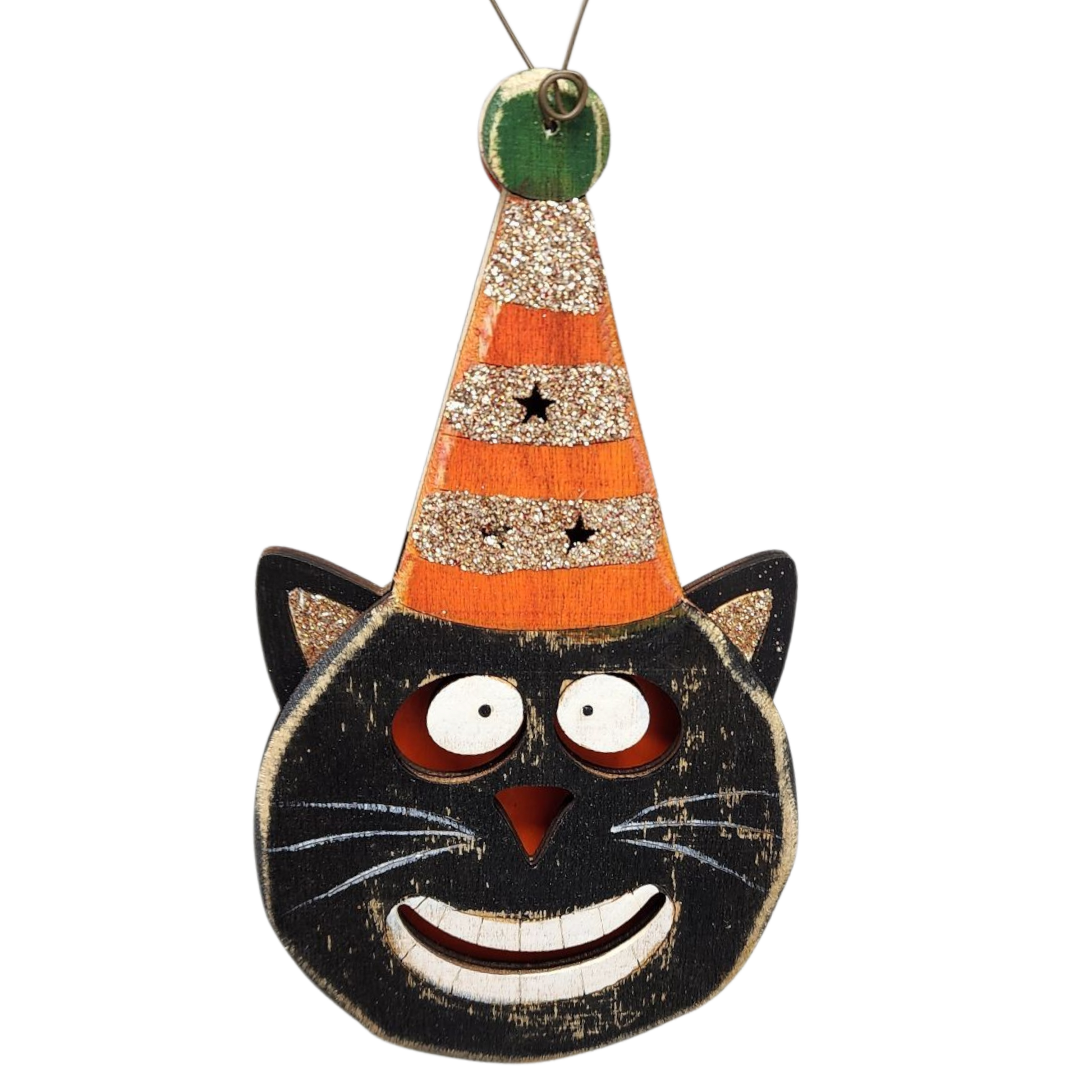 This cheerful black cat ornament wears a tall, striped party hat in classic Halloween colors, making it an adorable addition to your spooky holiday decor. Crafted from wood with a single-sided design, this ornament stands just over 5 inches tall and is perfect for hanging on your Halloween tree, in windows, or around your home to bring a playful spirit to the season. The wire hanger makes it easy to display anywhere you like, while the glittery accents on the hat add just the right amount of festive sparkle.