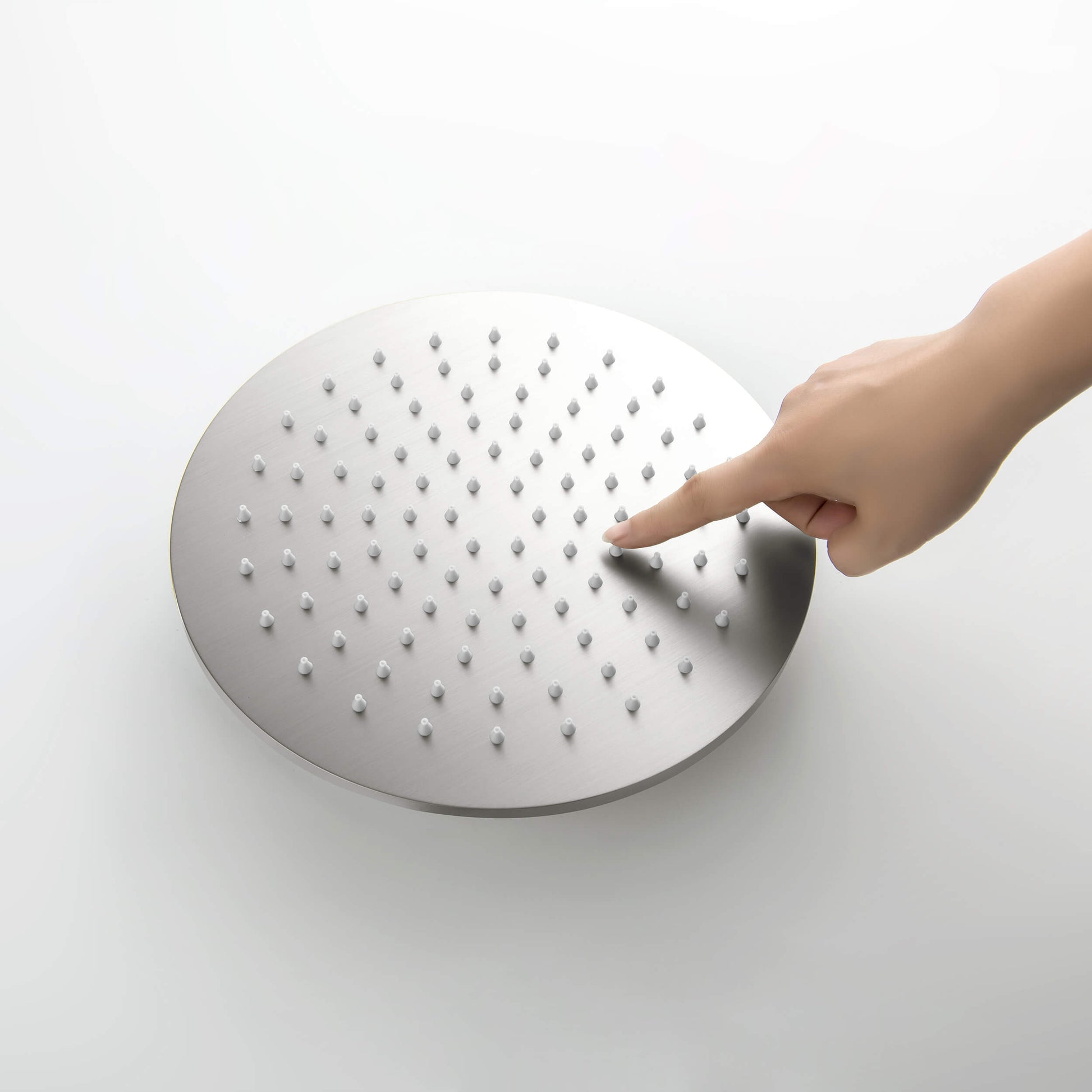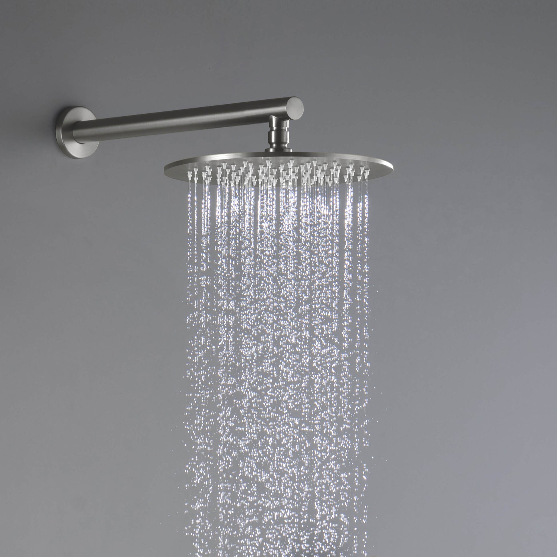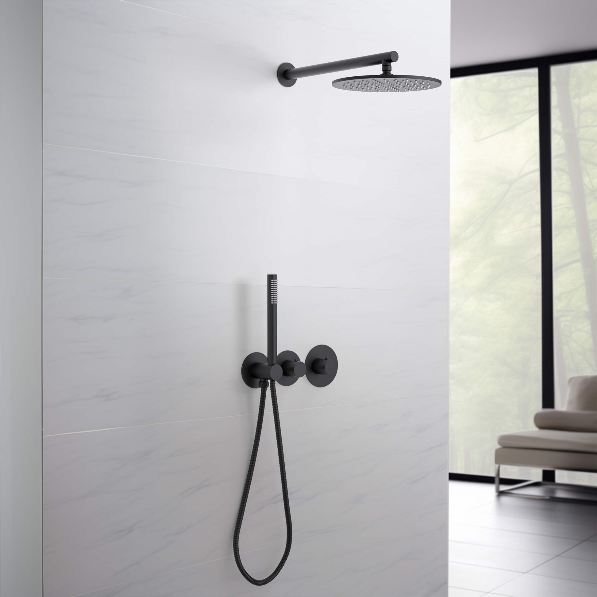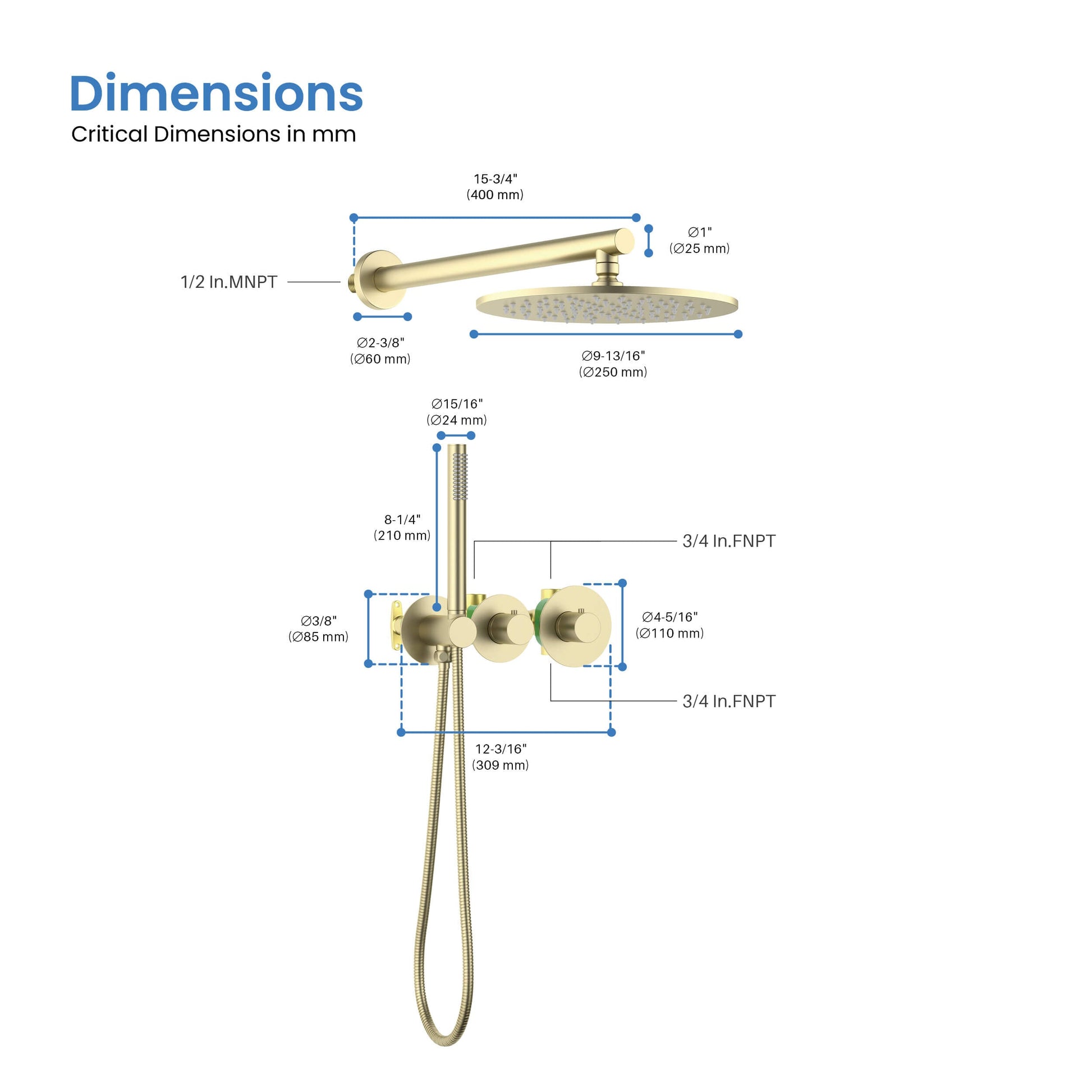 - Dual Functionality: This system offers two distinct shower functions, combining a 10" stainless steel rain shower for a luxurious rainfall experience with a brass handheld shower head for versatile and targeted rinsing.