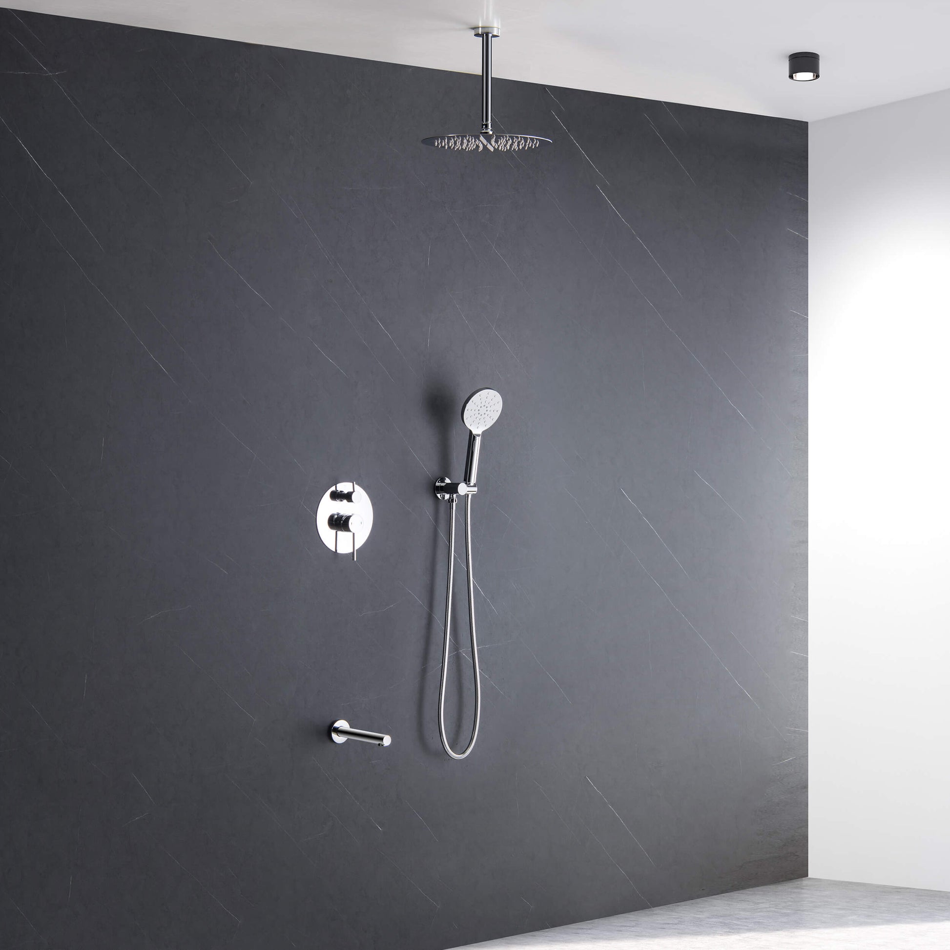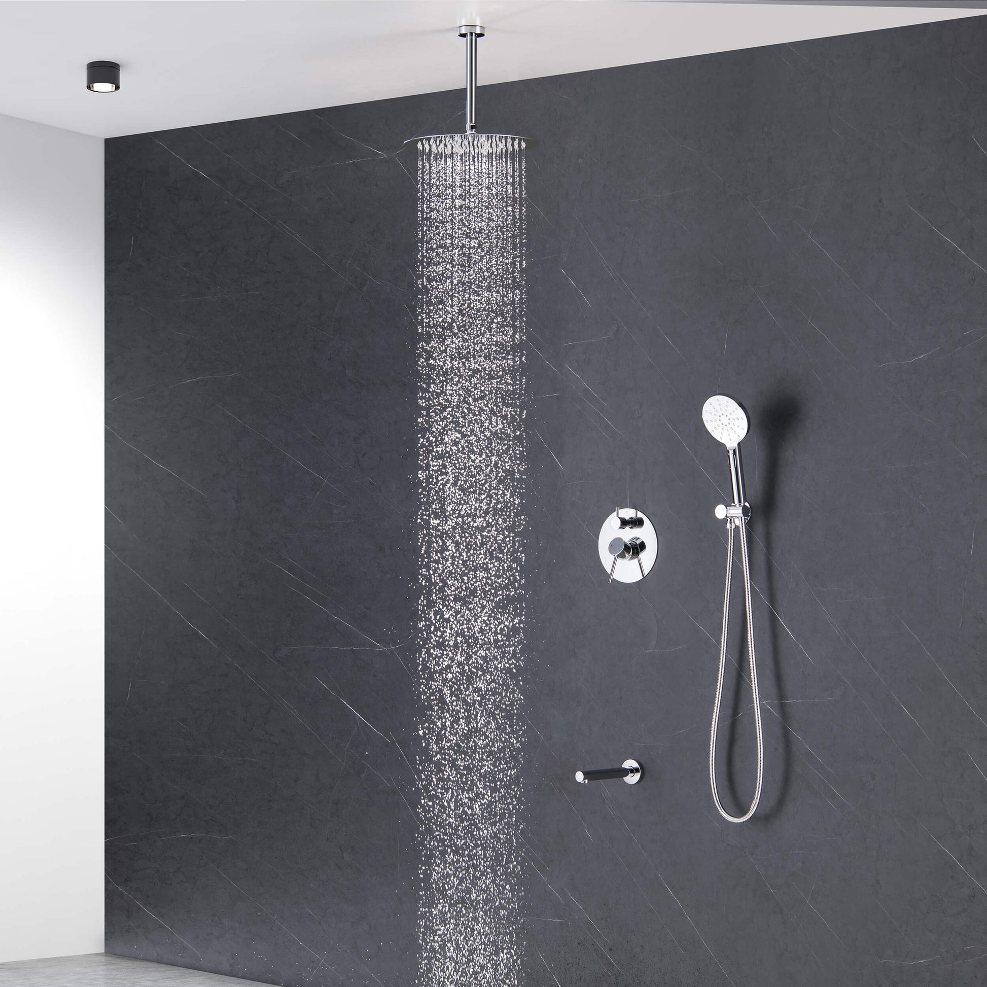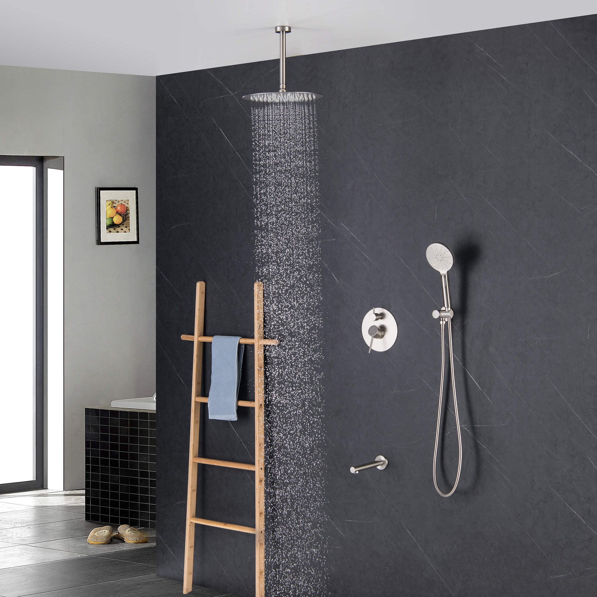 - Triple Showering Functions: Offering three distinct showering options, this system comprises a 10" stainless steel rain showerhead for a luxurious rainfall experience, a 3-mode handheld shower head for versatility, and a tub spout for added functionality, catering to diverse bathing needs.