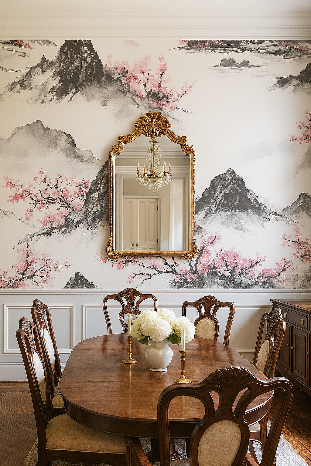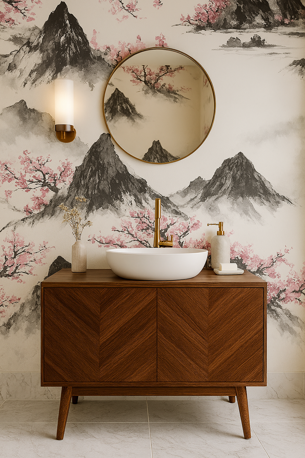 Soft cherry blossoms drift like morning fog across a pale rice-paper backdrop in Hanami Mist. Done in an elegant ink-wash style, this Japanese-inspired design feels gentle, timeless, and rooted in tradition. It’s perfect for serene tea rooms, wellness spas, or anywhere the presence of nature and stillness is desired. Breathe in. Let go.
