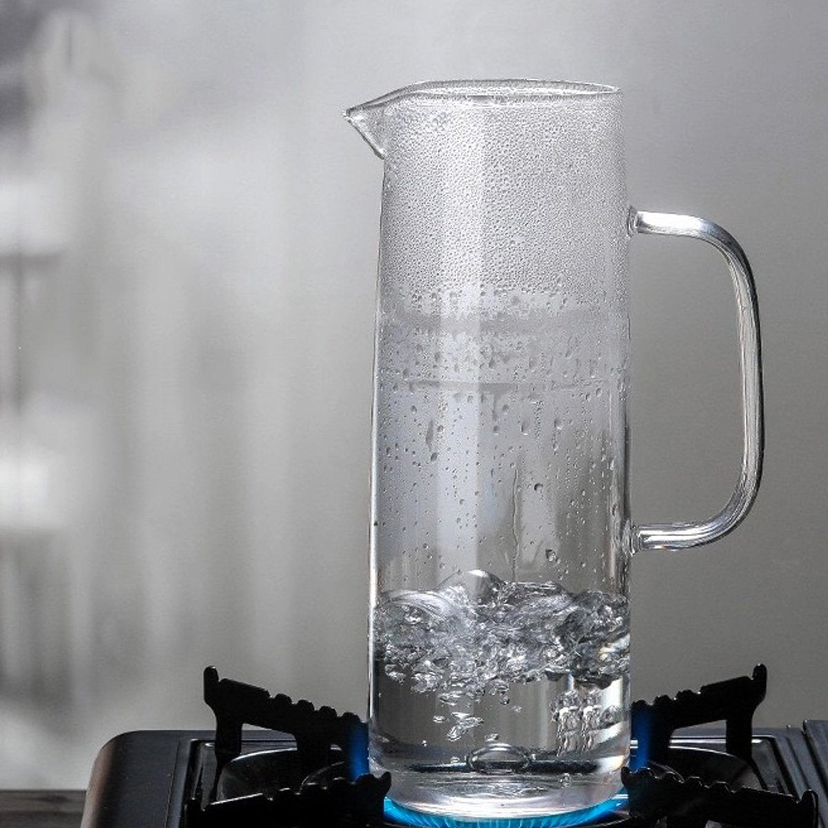 This hand blown glass pitcher with its sleek and cylindrical silhouette can be used for hot or cold drinks.
