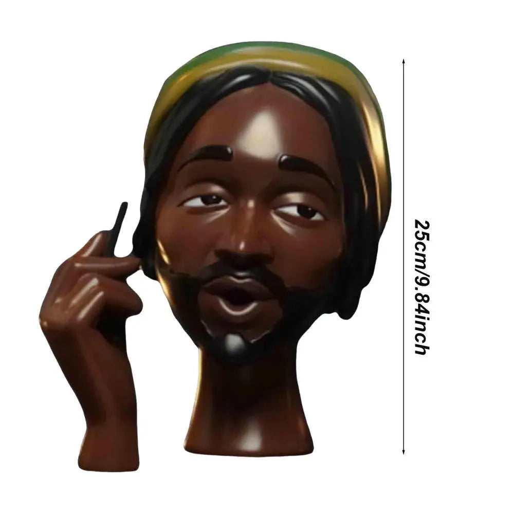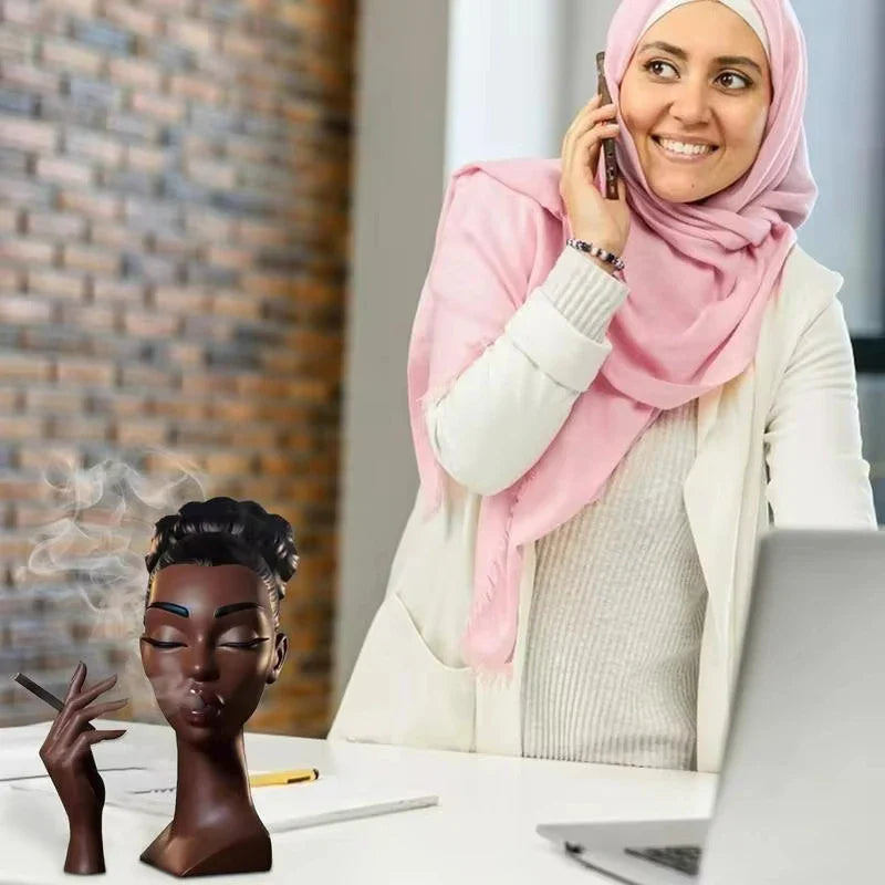 Enhance your living space with the Headscents Incense Holder Burner, a stunning piece of functional art that combines elegance with aromatherapy. Crafted from high-quality resin, this incense burner features the graceful head of a Black woman, elegantly styled with sleek, pulled-back hair and captivating facial features. The serene expression, with her closed eyes and subtle smirk, evokes a sense of relaxation, sophistication, and tranquility.