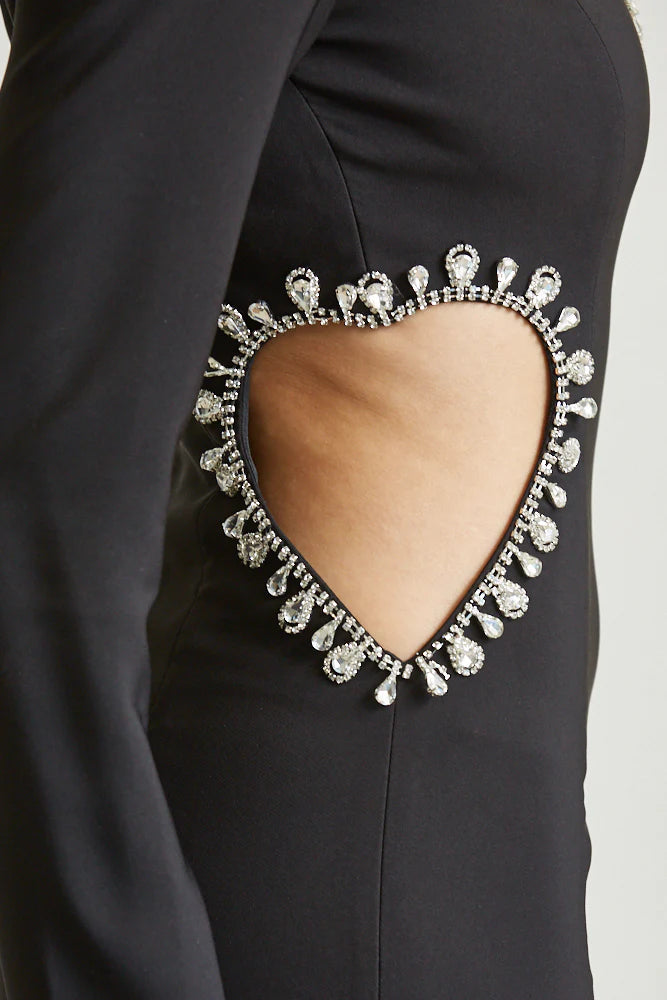 DRESS- SOLID WOVEN FABRIC- HIGH-NECK AND LONG SLEEVE- JEWEL EMBELLISHED HEART AND WAIST CUTOUTS- FITTED SHORT SKIRT- INVISIBLE ZIPPER BACK- 95% POLYESTER 5% SPANDEX