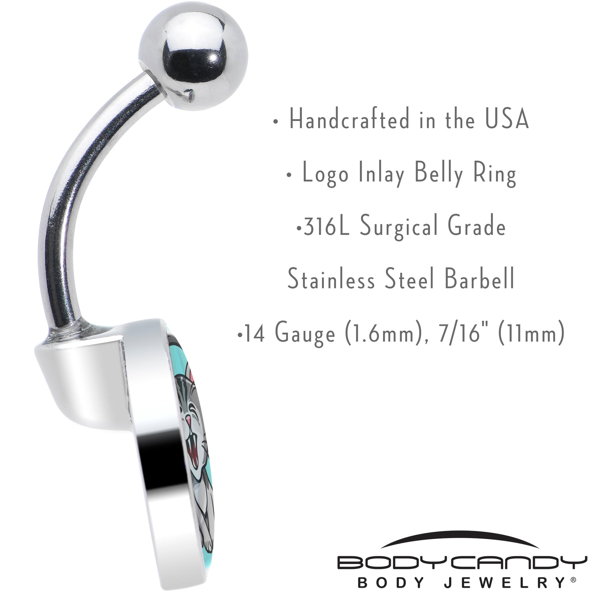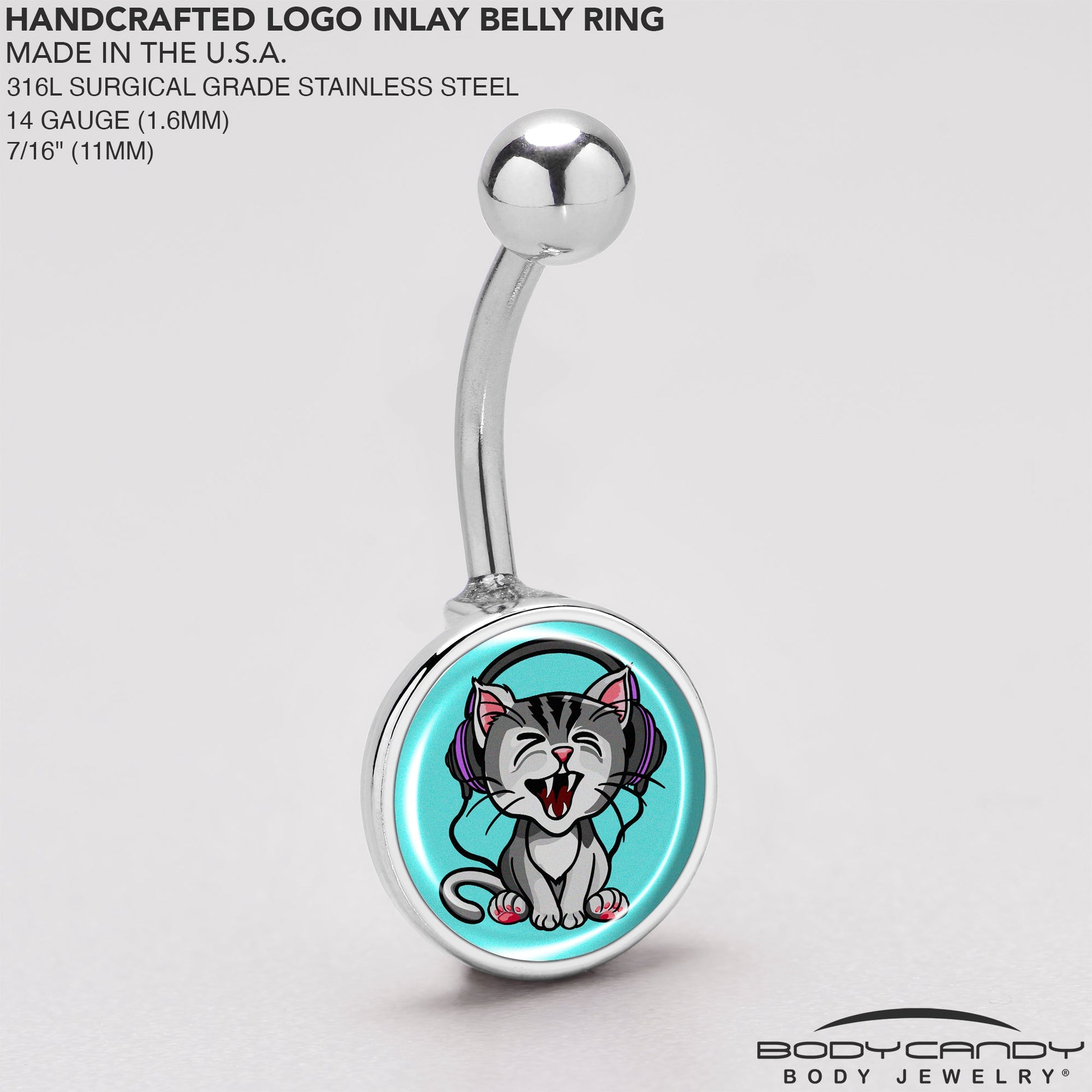Rock out like a knockout with the kitty on this 14 gauge navel ring. It's made with a 7/16 inch 316L surgical grade stainless steel curved barbell with a 5mm top ball end. The bottom end features a blue disc logo charm, featuring a grey cat wearing headphones and clearly getting it's groove on. Get ready to throw horns and headbang in style with this adorable metalhead kitty cat belly piercing jewelry.