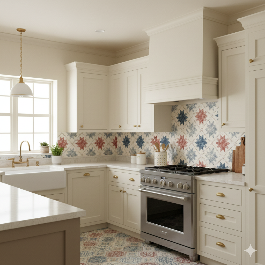 Inspired by traditional Americana quilting, this wallpaper features repeating starburst motifs in weathered blue and red across a stitched grid. The textured effect resembles hand-pressed fabric, blending craft heritage with modern design. Perfect for farmhouse kitchens, craft rooms, or cozy guest bedrooms, it adds charm and authenticity with a nostalgic twist.