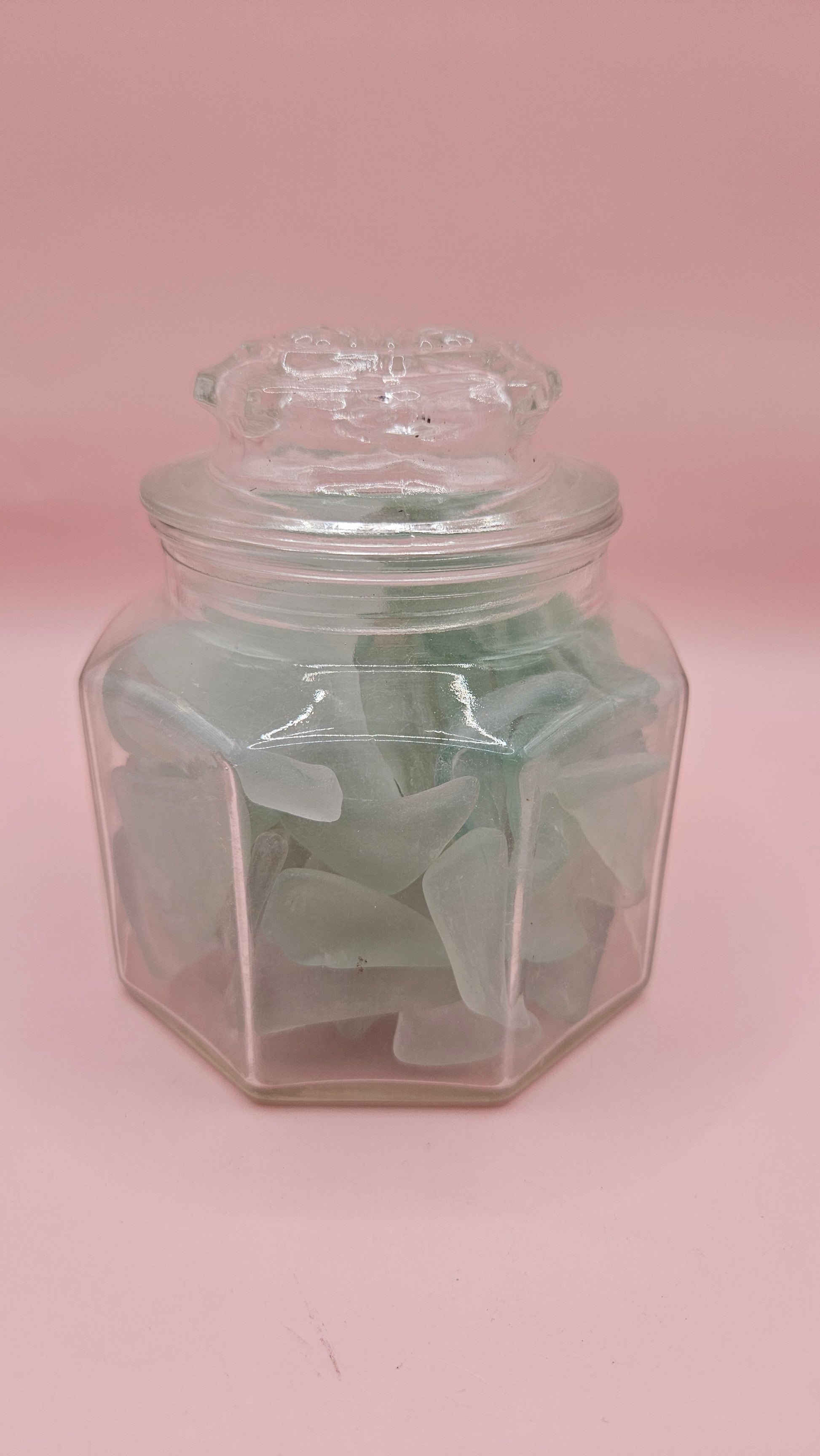Bring coastal charm to your space with this beautiful hexagonal glass jar brimming with frosted sea glass in a serene, ocean-inspired aqua hue. Perfect as a decorative accent for beach houses, nautical themes, or seaside-inspired interiors.