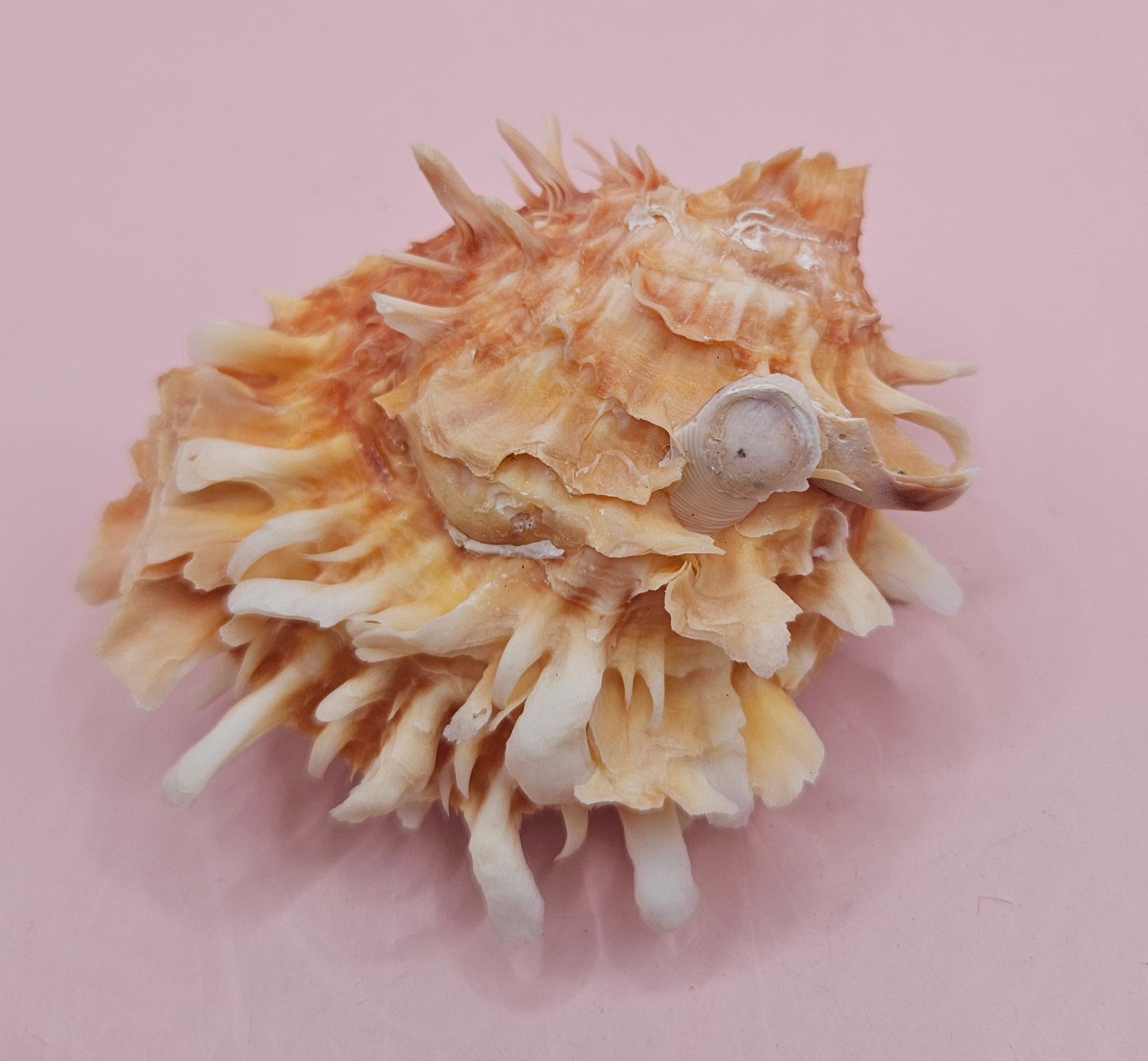 This hinged Spondylus shell brings coastal character with a touch of symmetry and charm. Still connected at the hinge, this 3x3 shell opens like a natural treasure box, showing off its soft ivory interior and spiked orange-toned exterior. It’s a wonderful conversation piece for display bowls, shadow boxes, or tabletop decor.