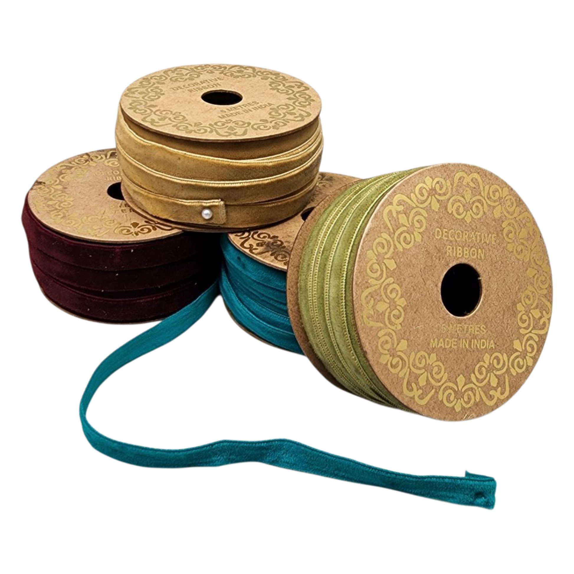 - Set includes four 5-yard spools of nylon velvet ribbon in burgundy, olive green, golden mustard, and cream