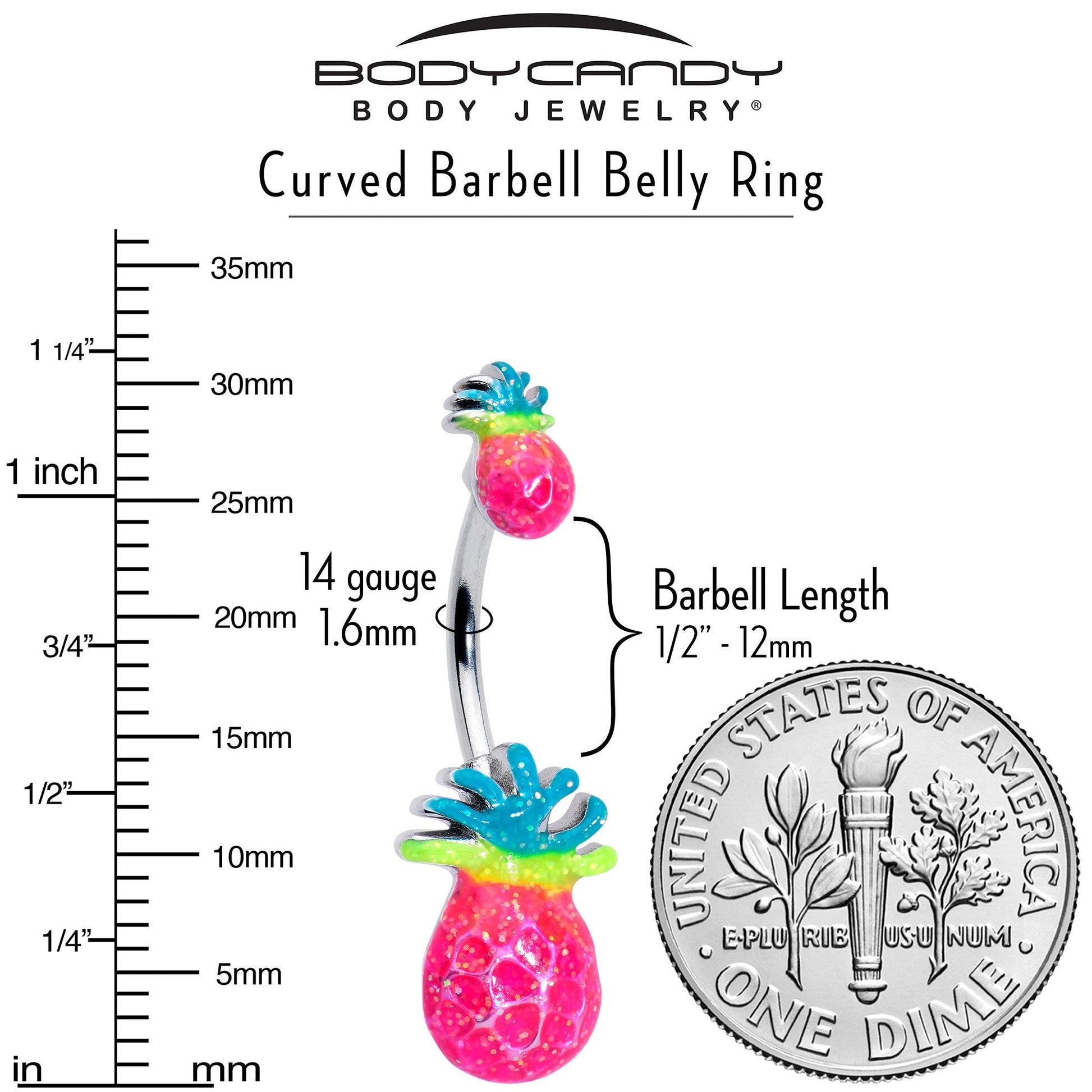 What could be sweeter than the ripe, juicy pineapples on this 14 gauge navel ring? It's made with a 3/8 inch 316L surgical grade stainless steel curved barbell. Each of the ends features a hot, hot pink fruit, with textured detailing. The pineapples are embellished with yellow tops and blue leaves for a trippy and tasty look. Get hot and juicy and totally sweet with this delicious looking belly piercing jewelry.Specifications