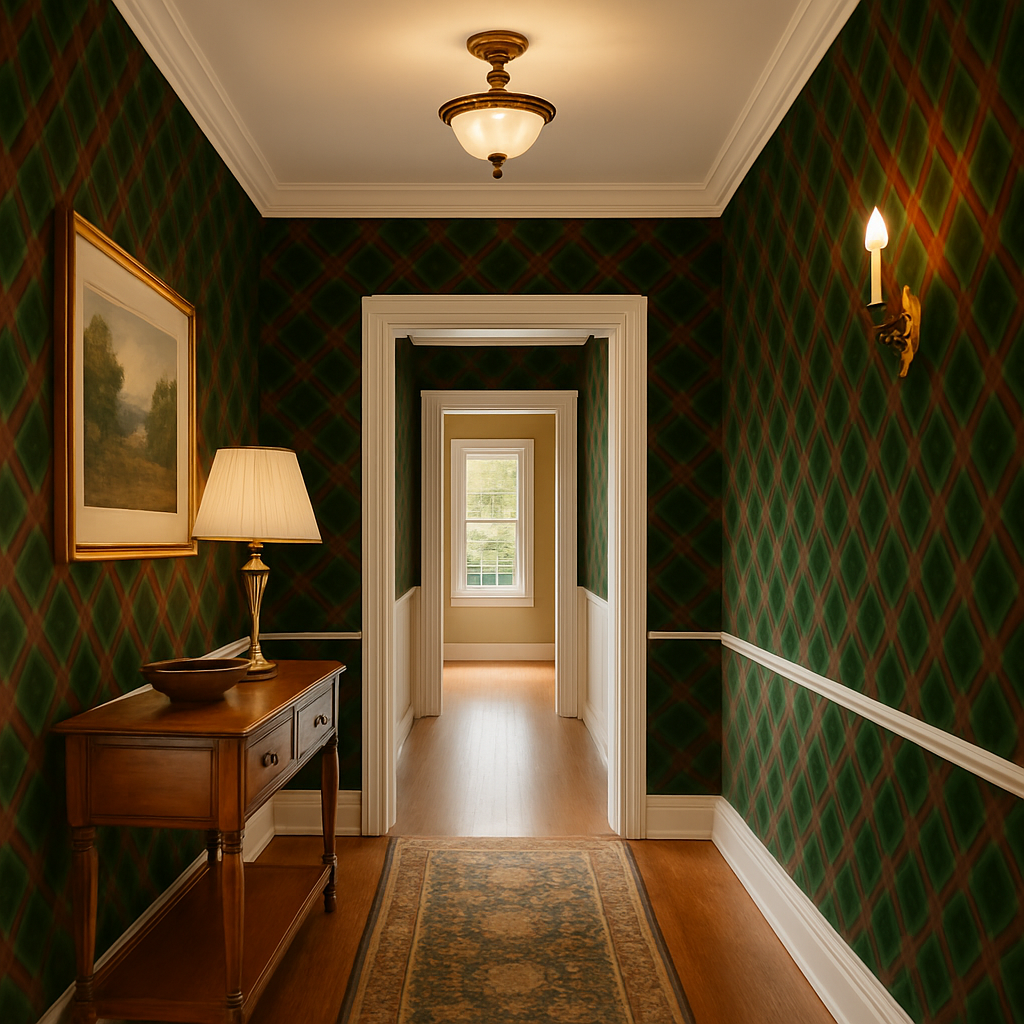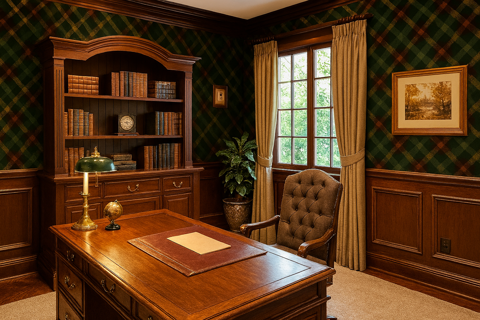 A timeless classic plaid in deep forest green, navy, and beige, this pattern channels equestrian clubs and country estates. The symmetrical balance and rich tones make it perfect for a masculine study, heritage dining room, or a preppy, layered interior. Search terms: green plaid wallpaper, tartan wall pattern, equestrian home decor, classic prep wallpaper