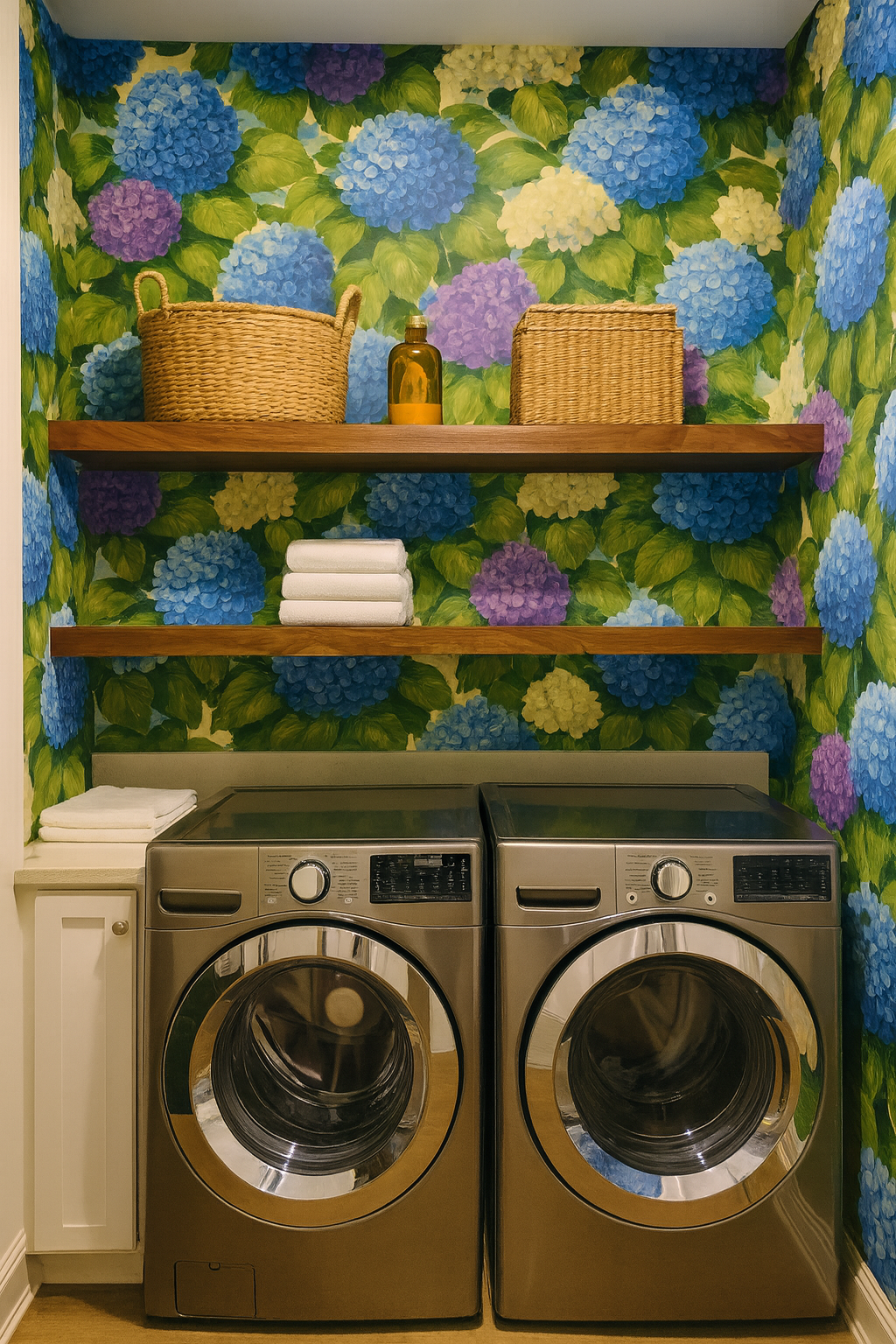 Celebrate a floral feast with “Hydrangea Jubilee,” showcasing oversized hydrangea blooms in a harmonious blend of sky blue, ivory, and lilac tones. Lush green foliage adds contrast, while the soft background allows each floral ball to pop. Ideal for statement walls in living rooms, hallways, or boutique-style dressing rooms, this pattern is bursting with vintage charm and garden-inspired elegance.