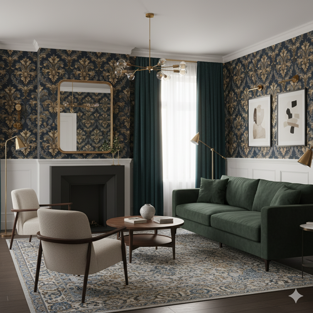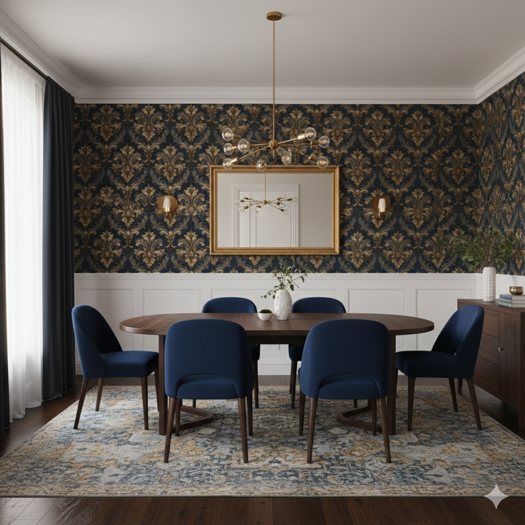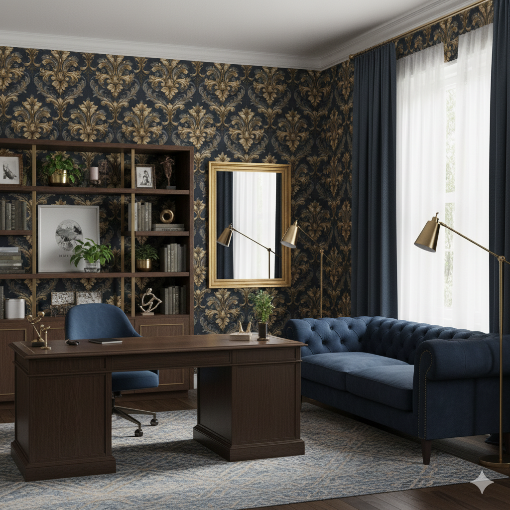 Golden flourishes curl into intricate medallions across a dark charcoal ground, recalling the grandeur of palace interiors. The raised, scroll-like details are shaded with depth, making the motifs feel sculptural. This wallpaper exudes formality and power—it works best in grand foyers, formal dining rooms, or even boutique hospitality spaces that want to convey strength, drama, and historic opulence. Paired with candlelight or chandeliers, it amplifies the sense of theater.